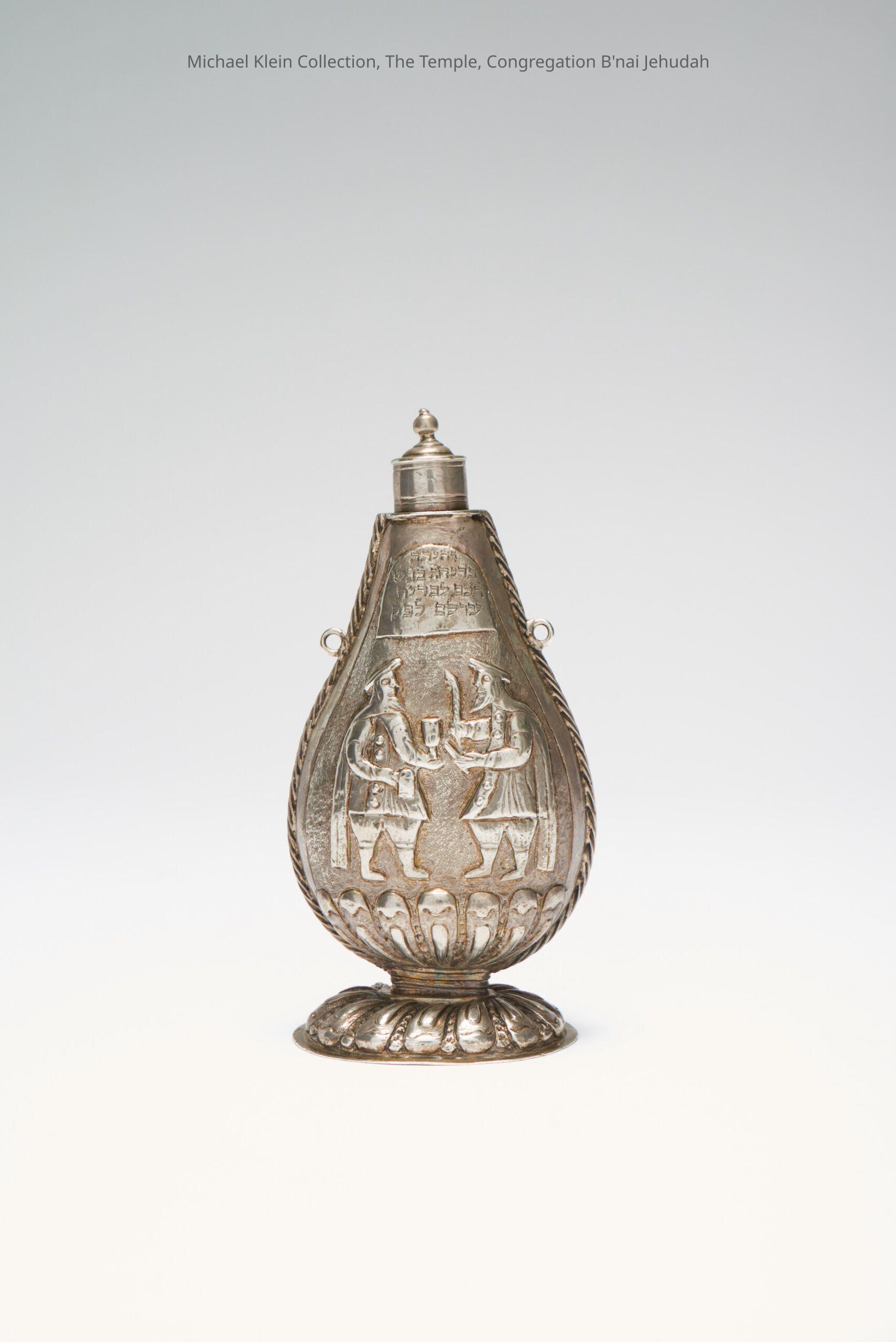 This silver flask for astringent powder is decorated with chased scenes relating to the circumcision ceremony. It is engraved with a Hebrew dedication to Raphael Son of Kavifman, text for "And Your Brit Should Be for Brit Forever," and the date of 1744.Made/Created
