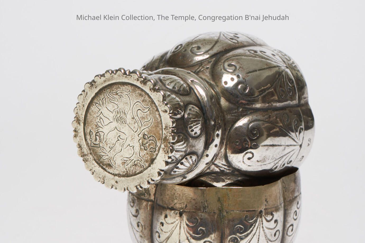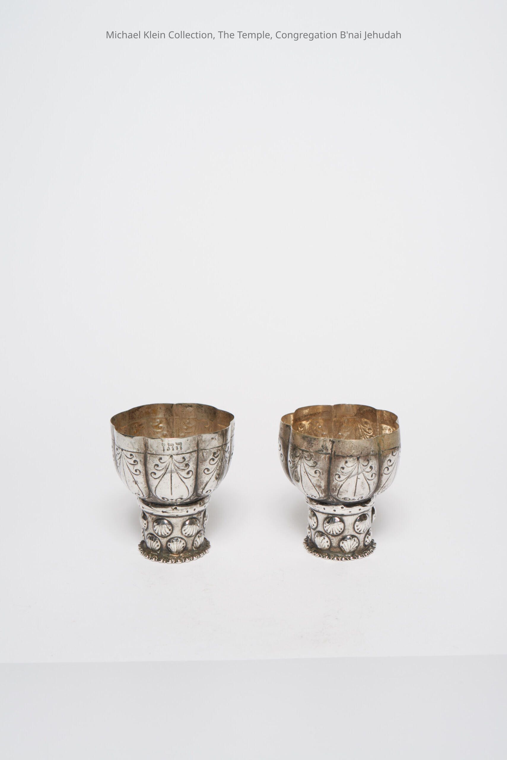 Interlocking cups engraved with "happy bride and groom" and an acronym for "mazel tov."Made/Created