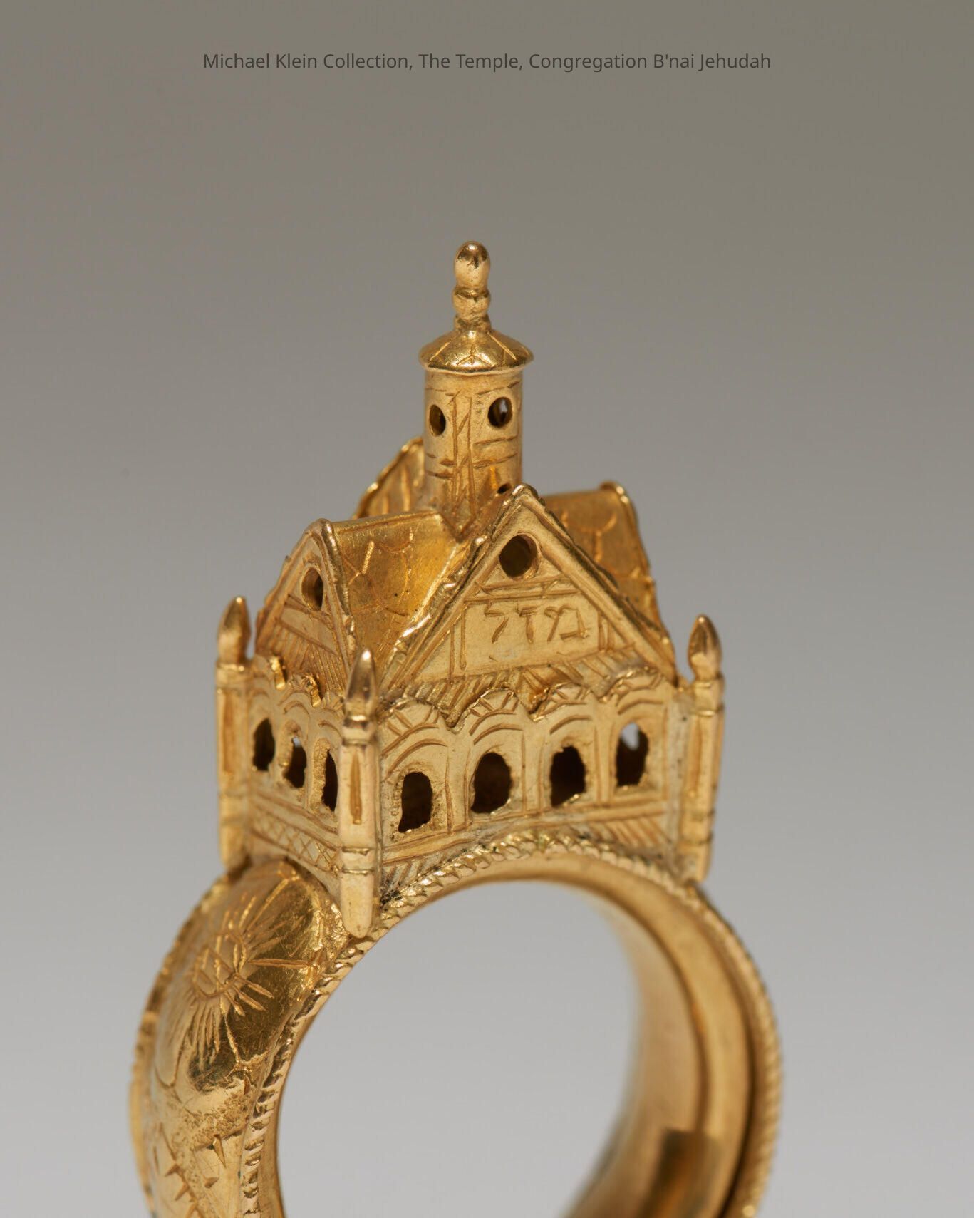 The castle-shaped top of this ring is engraved "Mazel Tov." This ring would have been worn by a bride during a wedding and exchanged for a plain band as part of the ceremony.