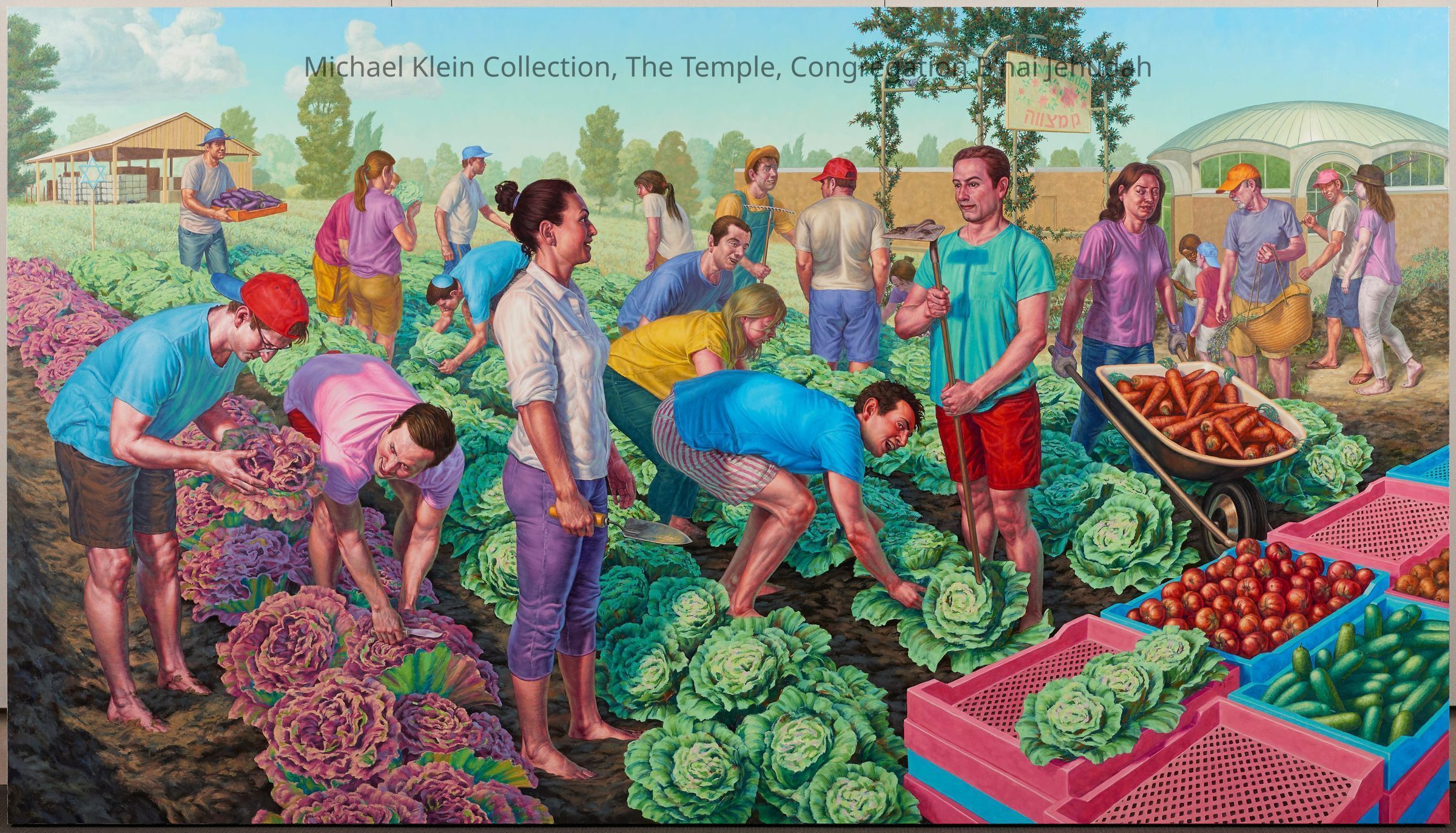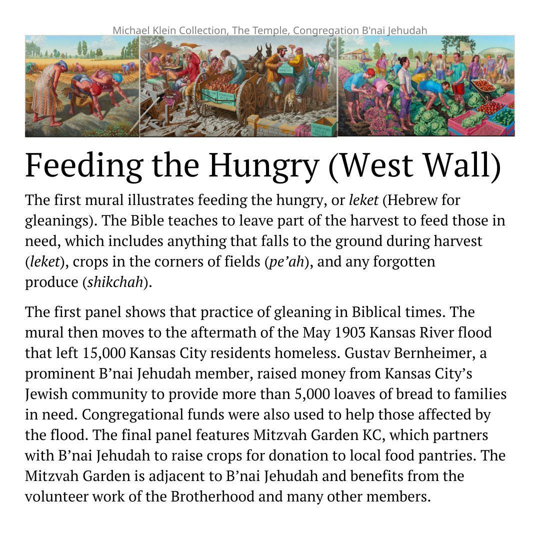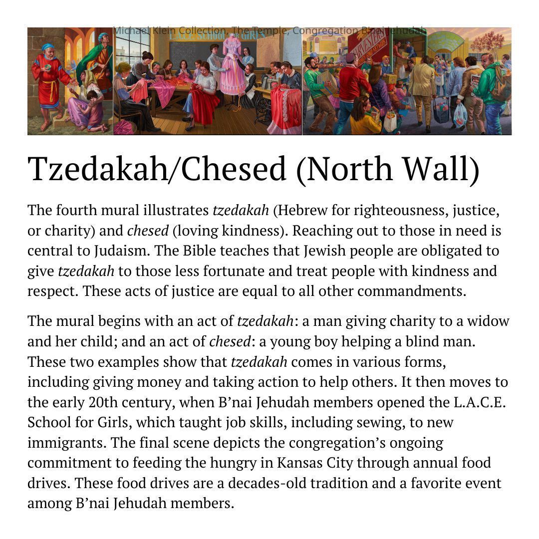 Eight canvases that share the story of Judaism and the community service throughout the ages. The first one on each wall shows a biblical time, the one in the middle shows more recent times, and the end of each wall shows present day Jewish people continuing the community service acts.Made/Created
