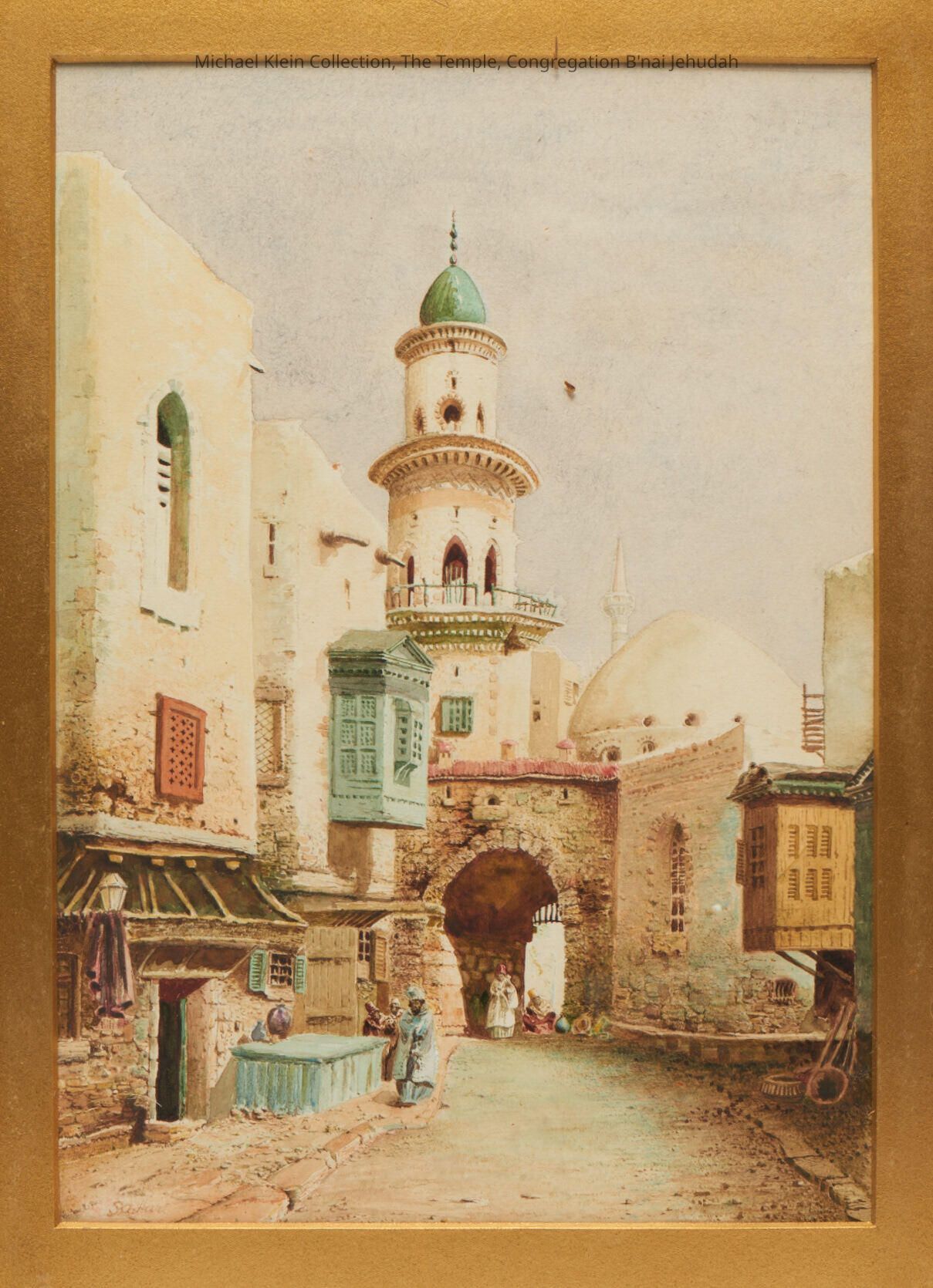 Scene of city street, mosque rising above. Artist was a painter and engraver, first Jewish member of the Royal Academy in London.Made/Created