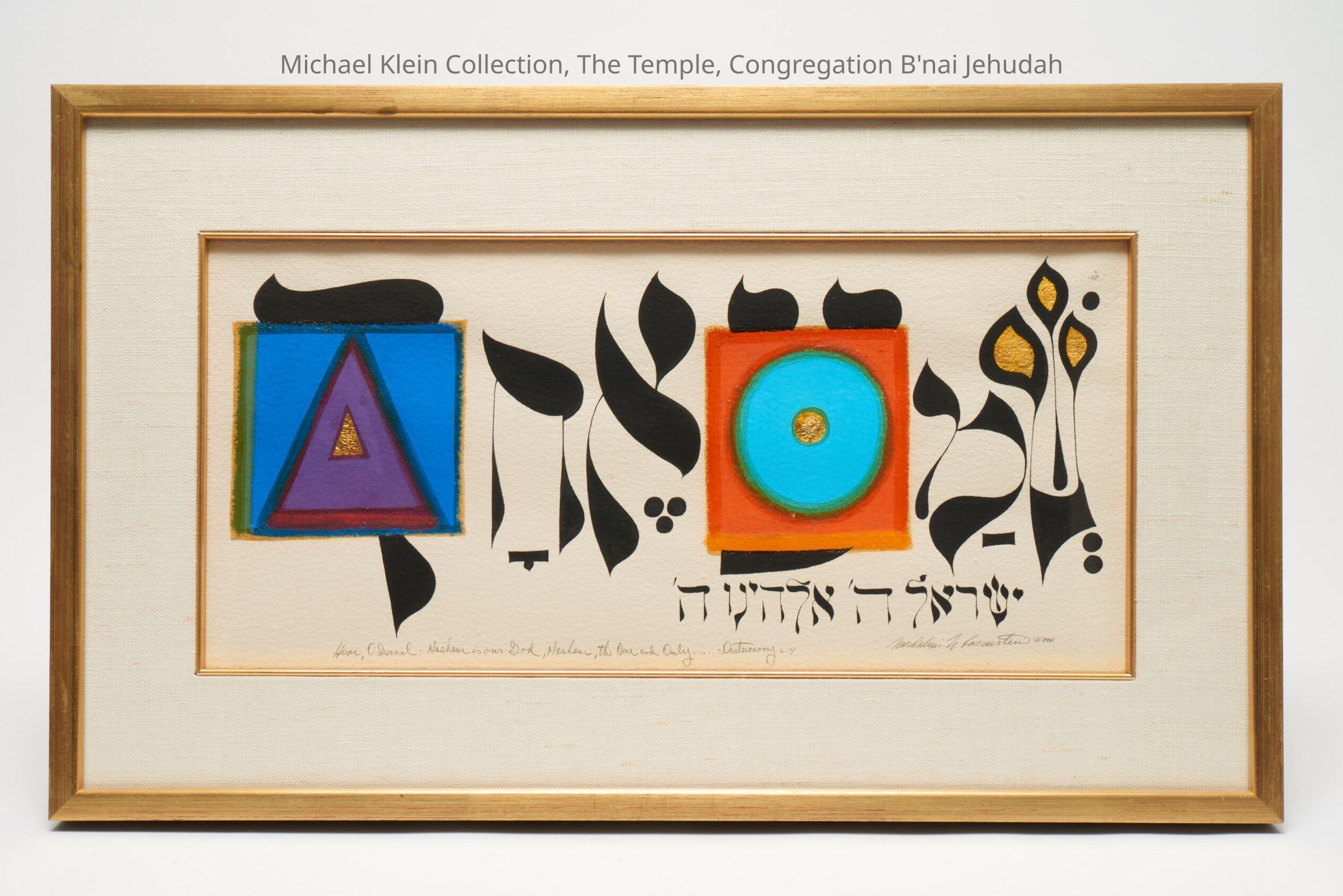 "The shema prayer in most prayer books is printed with the eyen of the word "shema" and the daled of the last word "echad" made larger. We should visually pick this up and be reminded that we are witness to the unity and oneness of God. In first Temple times our alphabet was written differently: the form of the eyen was a circle, a daled was written as a triangle. Artist has combined these two traditions in this composition.Made/Created