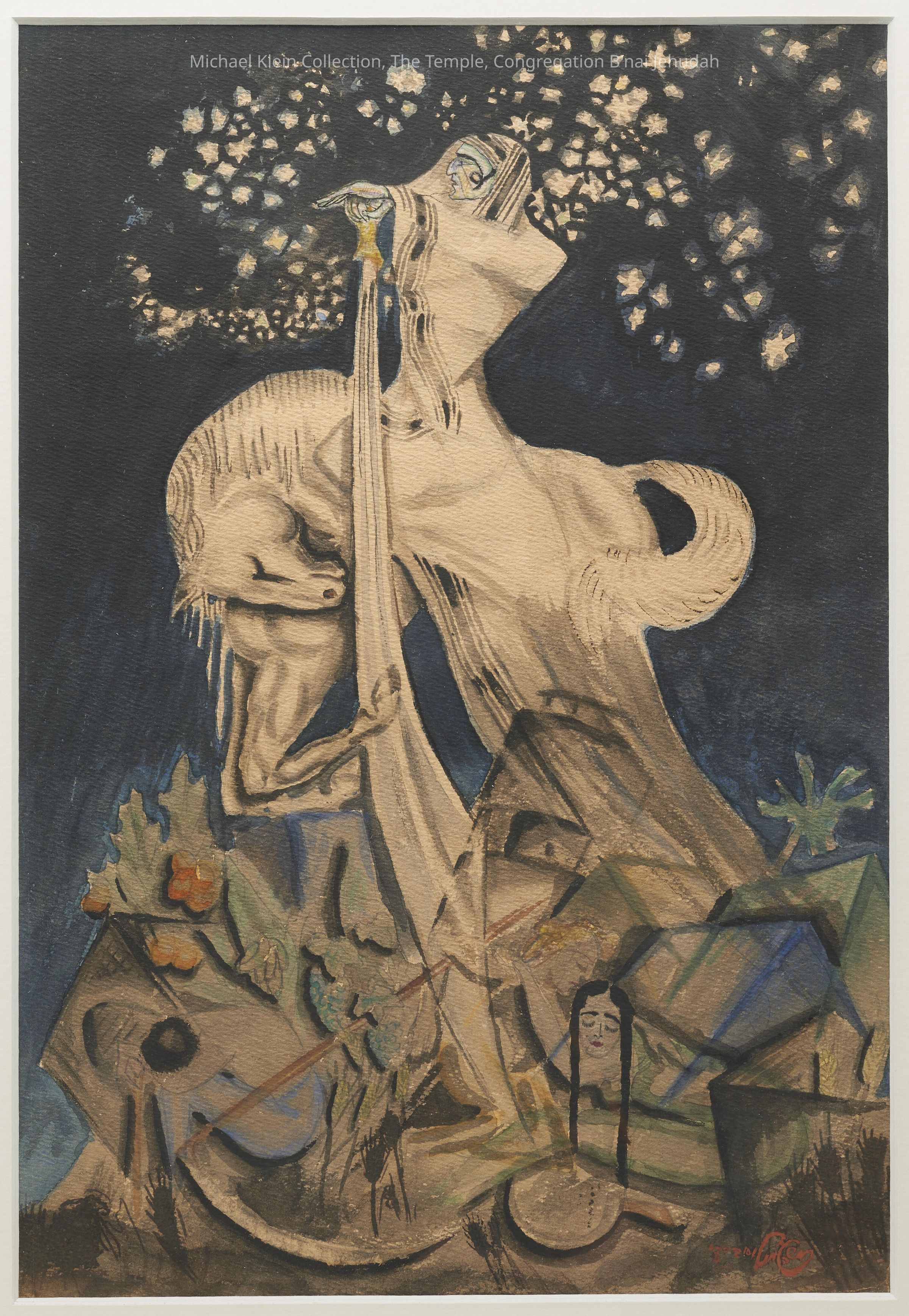 Figure on a horse, wearing headdress and wielding a sword against a night sky. Appeared on the cover of a Hungarian magazine. Painting is mentioned and described at length by curator and art critic Gideon Ofrat in his 2005 book "Chapters on Israeli Artists" (in Hebrew).Made/Created