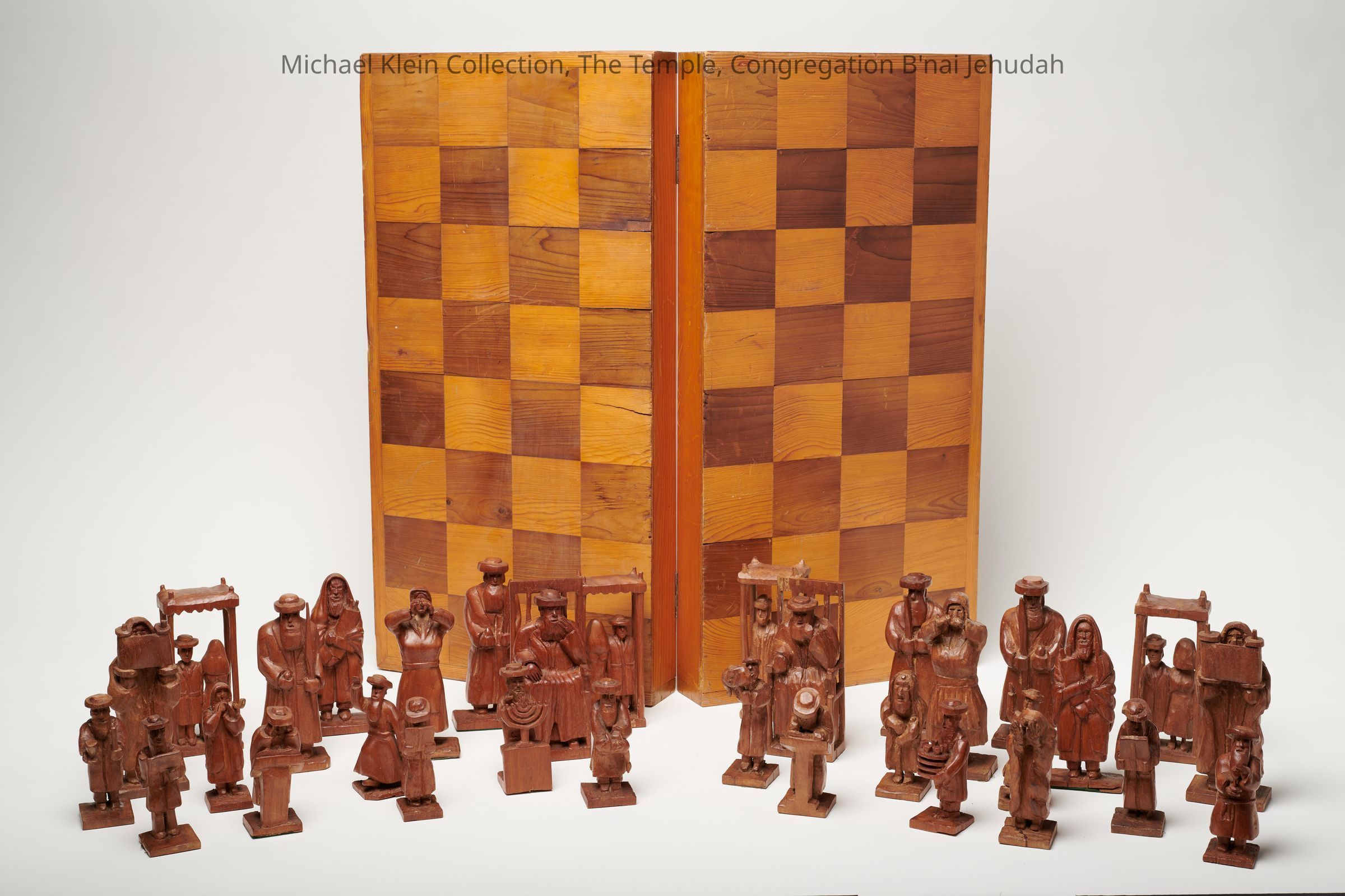 Hand carved, unique folk art set. Each figure illustrates a different Jewish tradition. Wood is not olivewood, so likely from Europe. Postwar.Made/Created