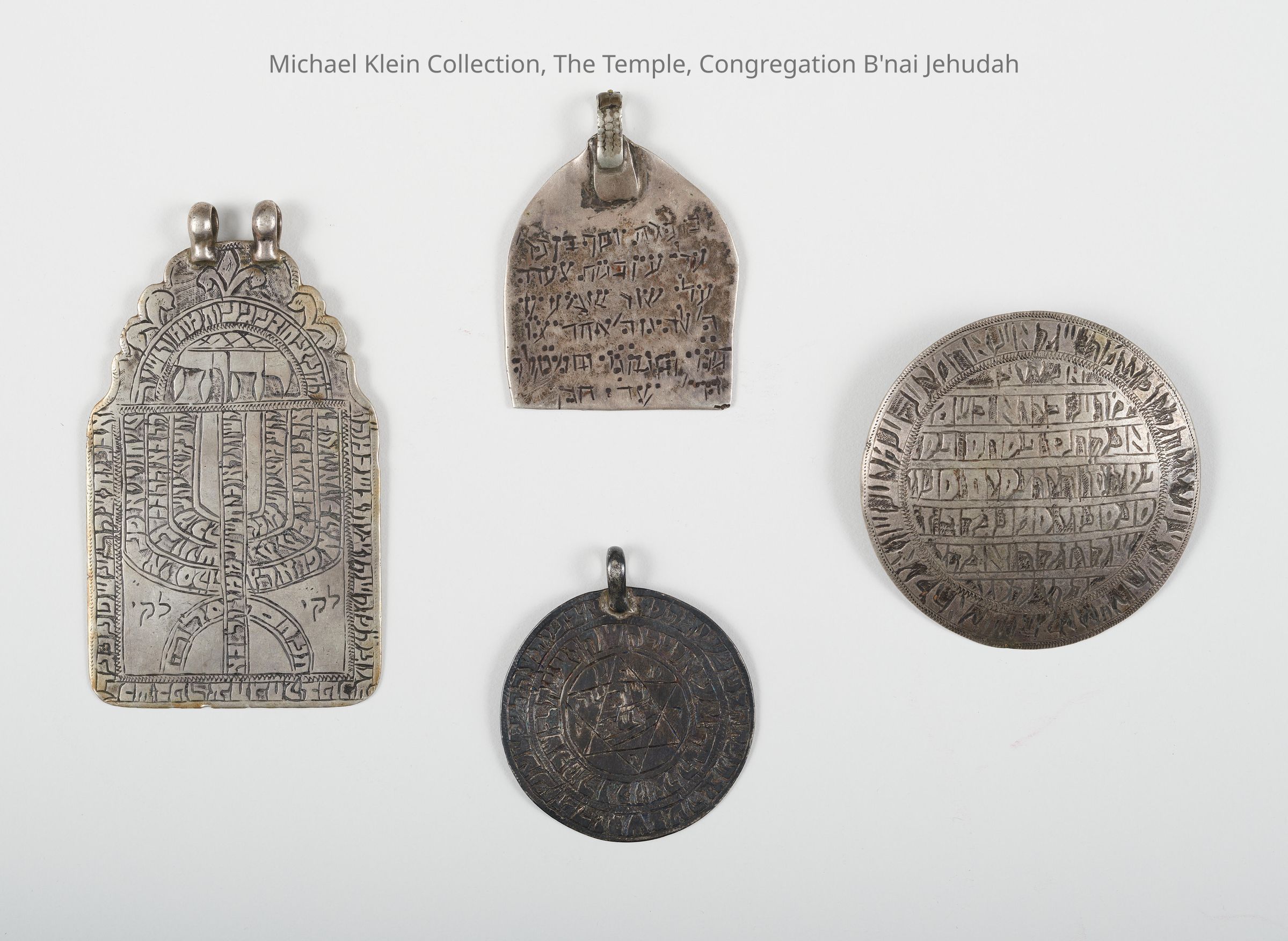 1. Round, decorated with Kabbalah writings, star of David in center. Hook on top for hanging. 2. Stylized leaf shape with engraved menorah. "Lemenazech" and other verses. 2 hooks. 3. Arabesque shape, engraved "Ben porat yosef." Hook on top. 4. Round in shape of shield. Two hooks on back.Made/Created