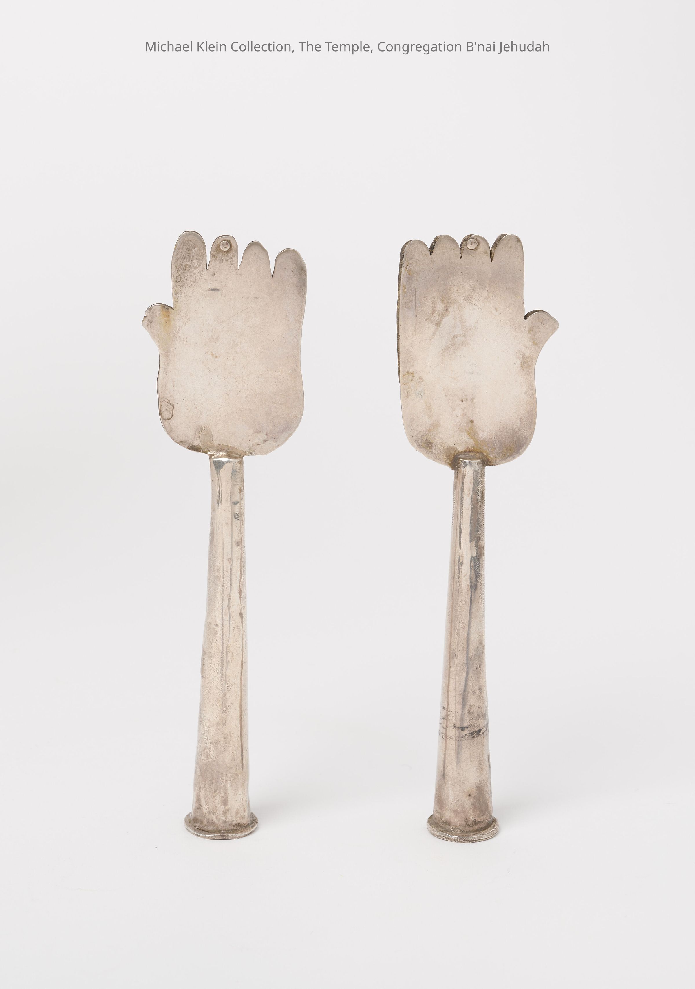 Topped with hamsa-style hands. Engraved with the Kabbalistic Hebrew inscriptions "Ali Shir" and "Ben Porat Alie Ayin." Very rare.Made/Created