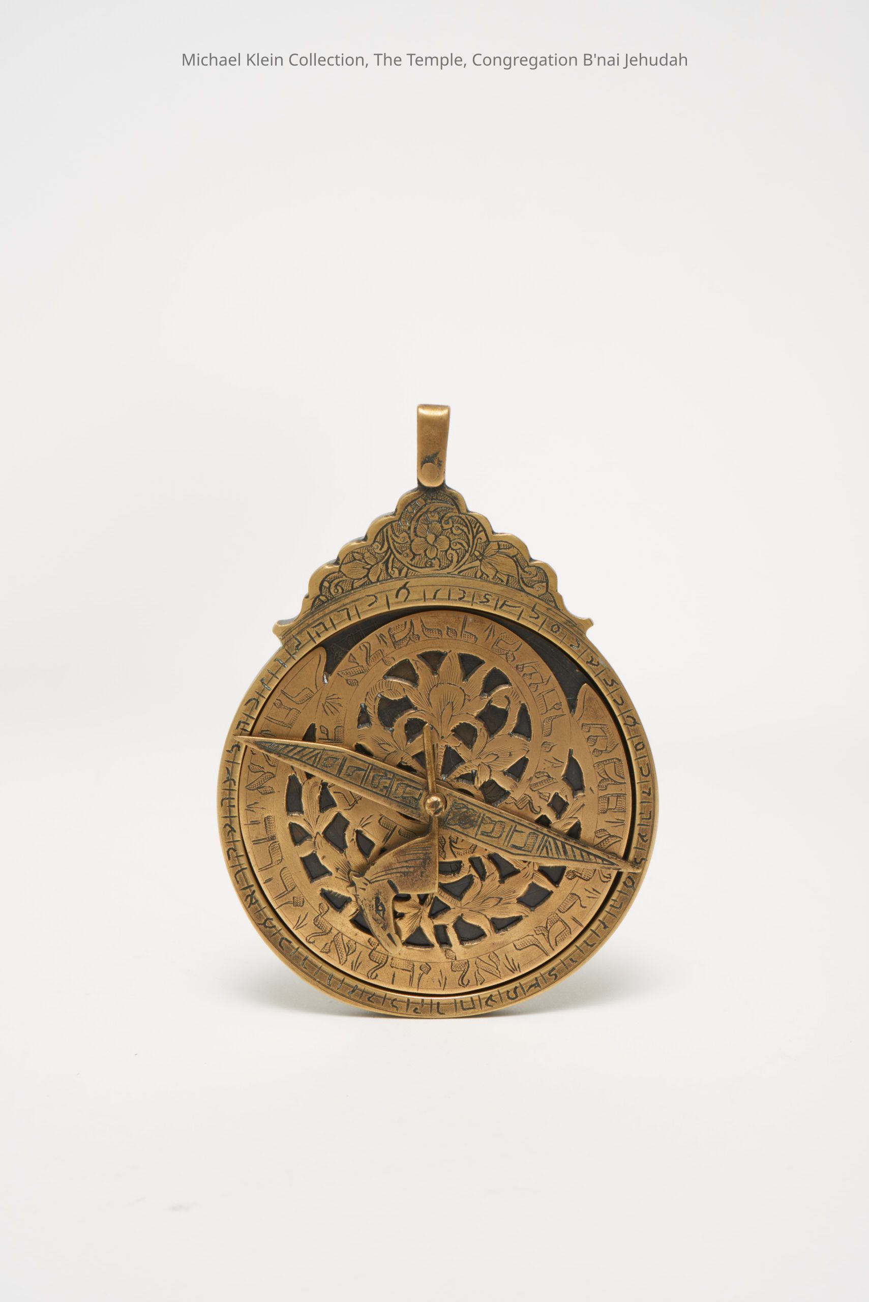 Hebrew incriptions throughout the astrolobe with the zodiac signs on the back. Three discs inside astrolabe with the broze on one top.Made/Created
