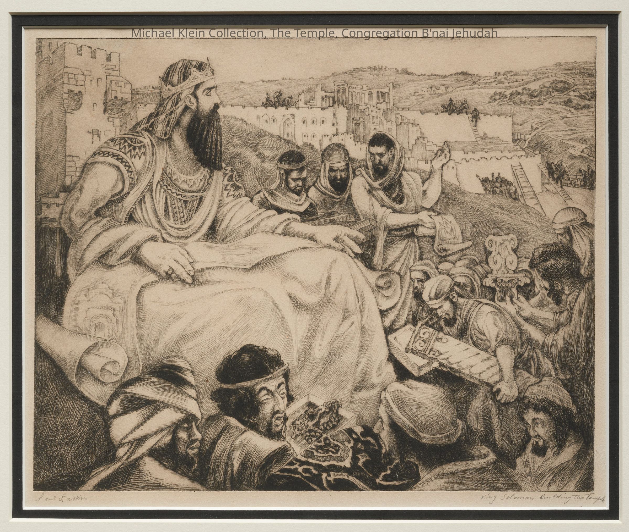 King Solomon builidng the Temple is the official title of the drawing and the author's signature is on the left side. Pen and pencil drawing.Made/Created