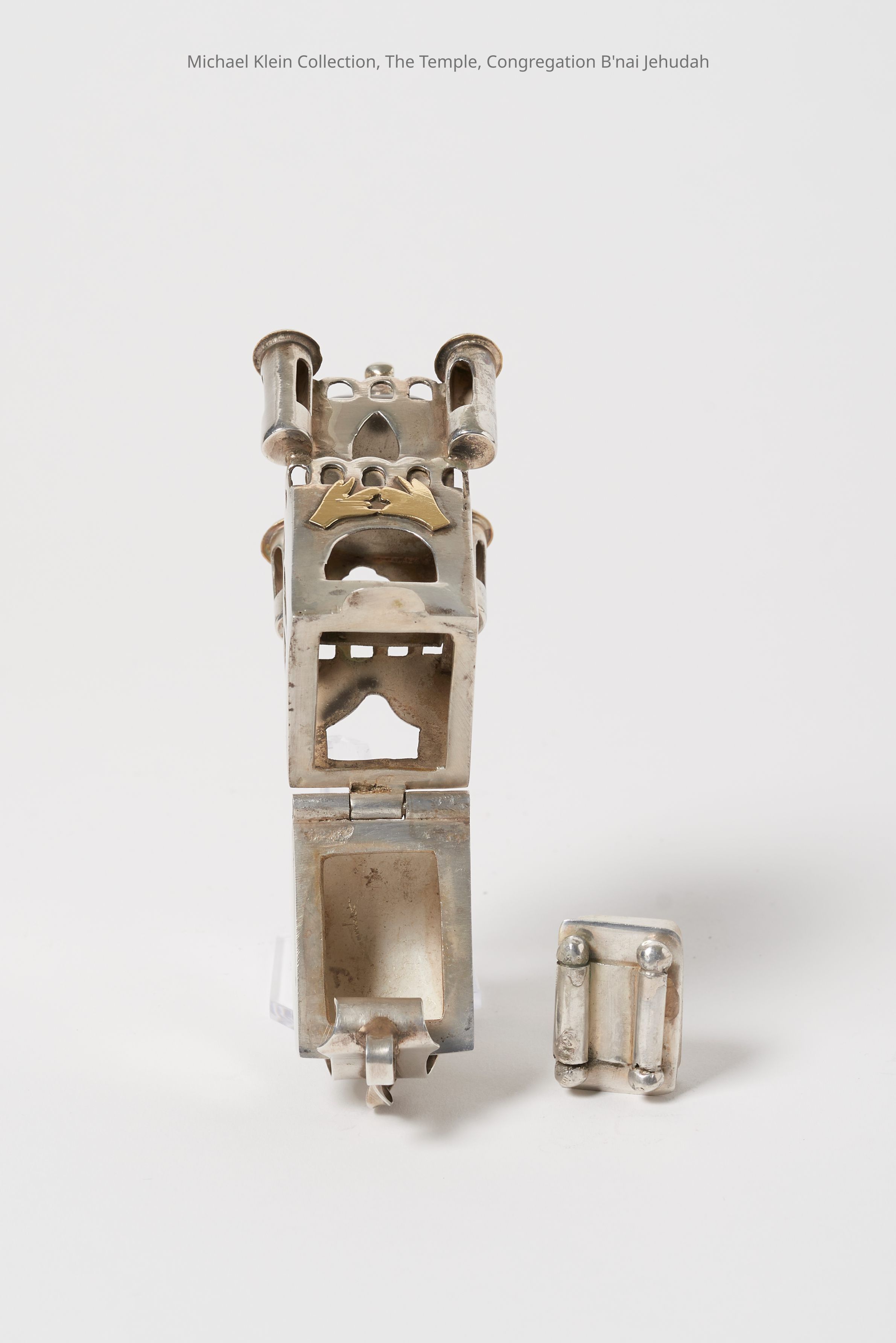 Castle shape. "Mazel tov" on ring. Kohen hands on side. Removable scroll inside; probably a compartment for spices.Made/Created