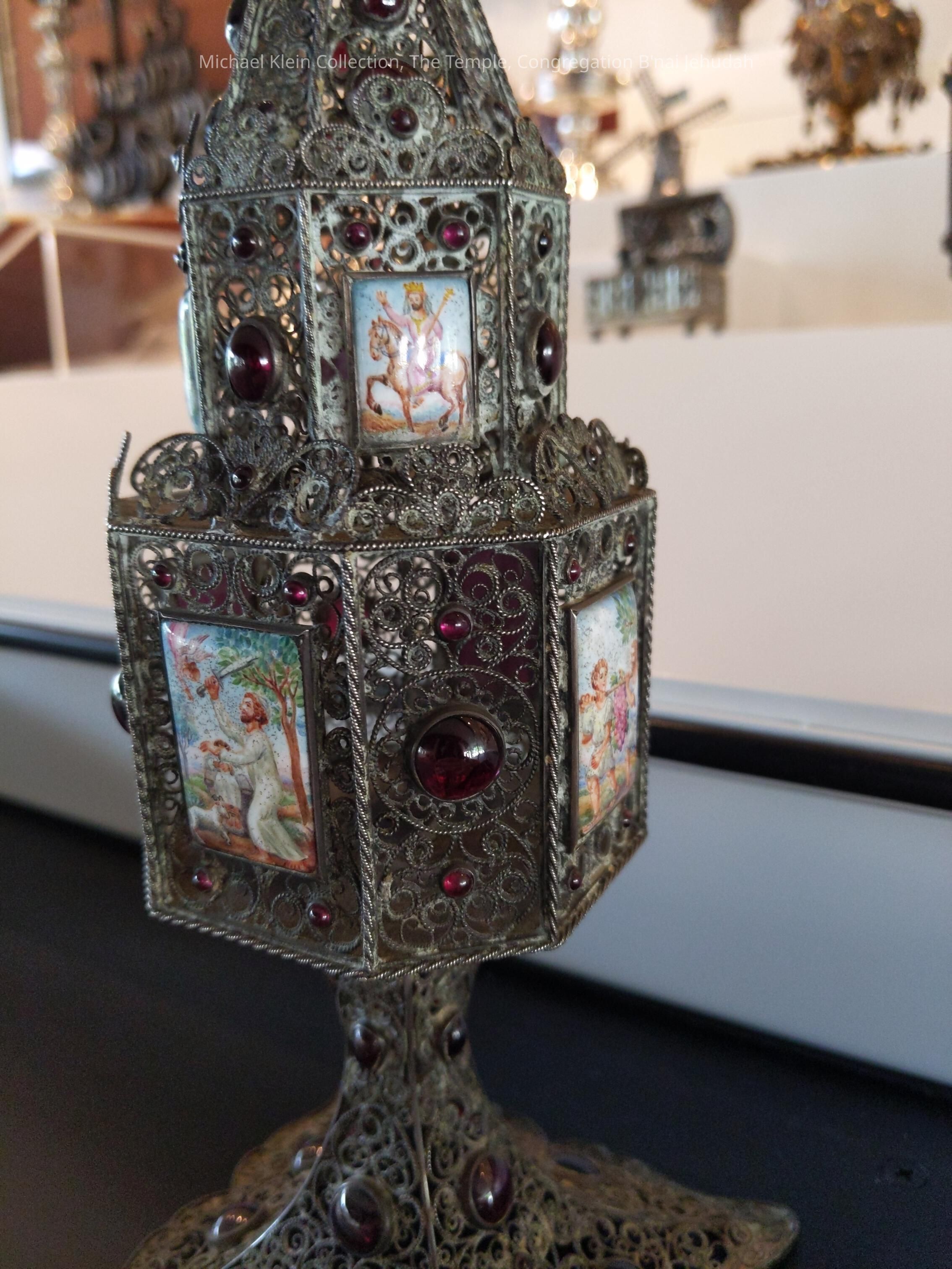 Silver filigree with four applied enamel scenes on top and four larger scenes on the bottom