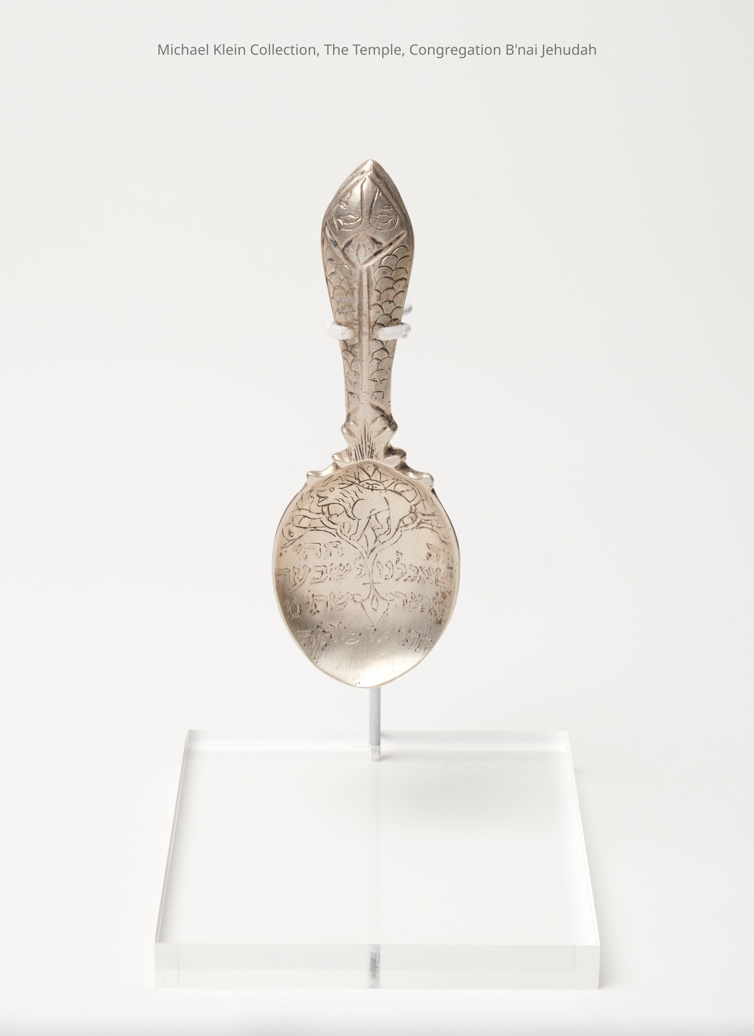Cast, engraved and chased. Handle in shape of a fish. Engraved with national symbol of Iran: lion against a rising sun. Hebrew inscription: "May what we eat and drink be to our satisfaction and have medicinal effects."