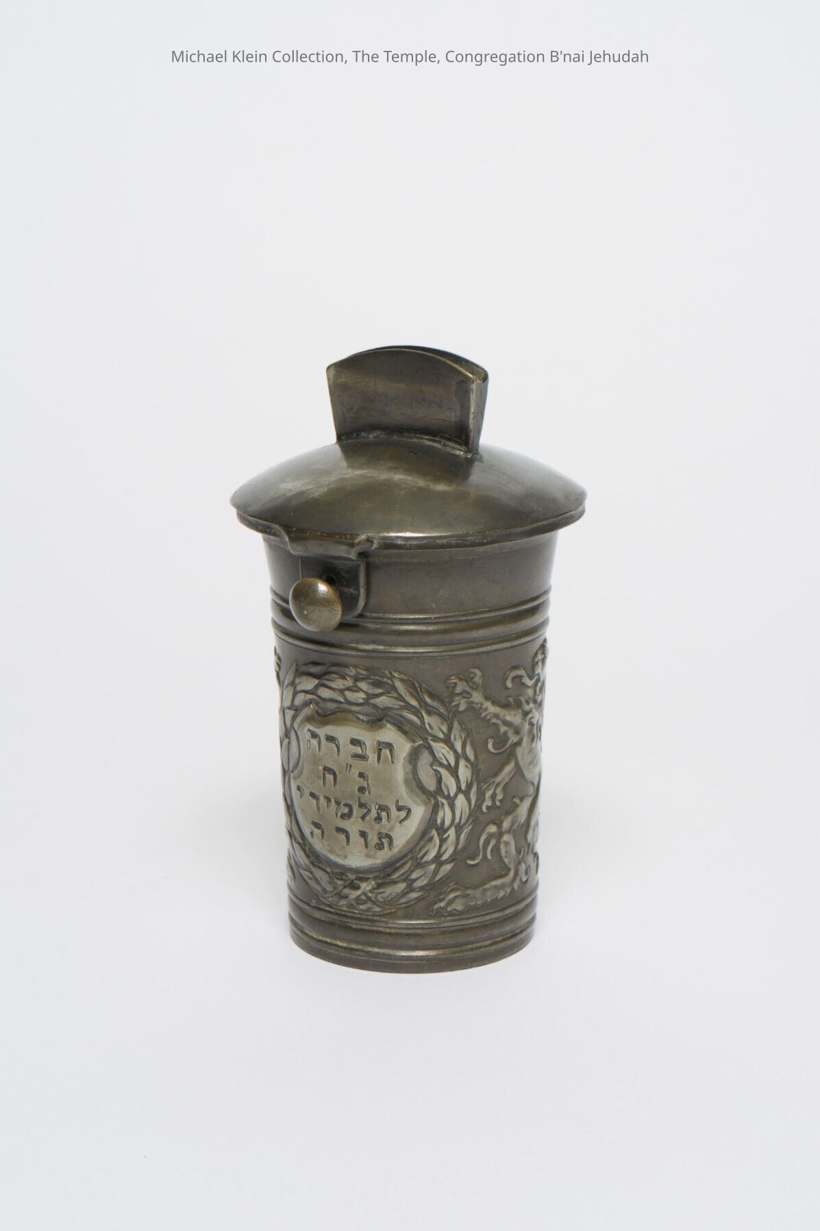 Converted from drinking cup. Inscription: "Funds to loan to students of Torah."Made/Created