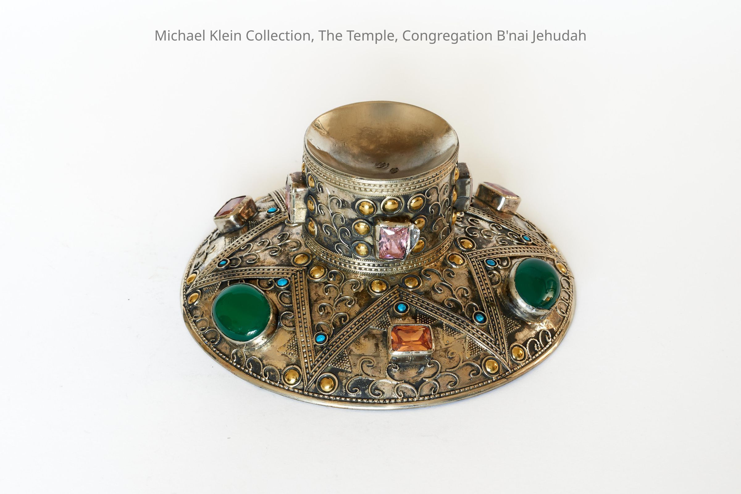 Filigree ornaments on parcel gilt motifs with "last waters" inscription in Hebrew on basin. Hebrew, "mayim achronim," or "last waters." For hand-washing after a meal.Made/Created