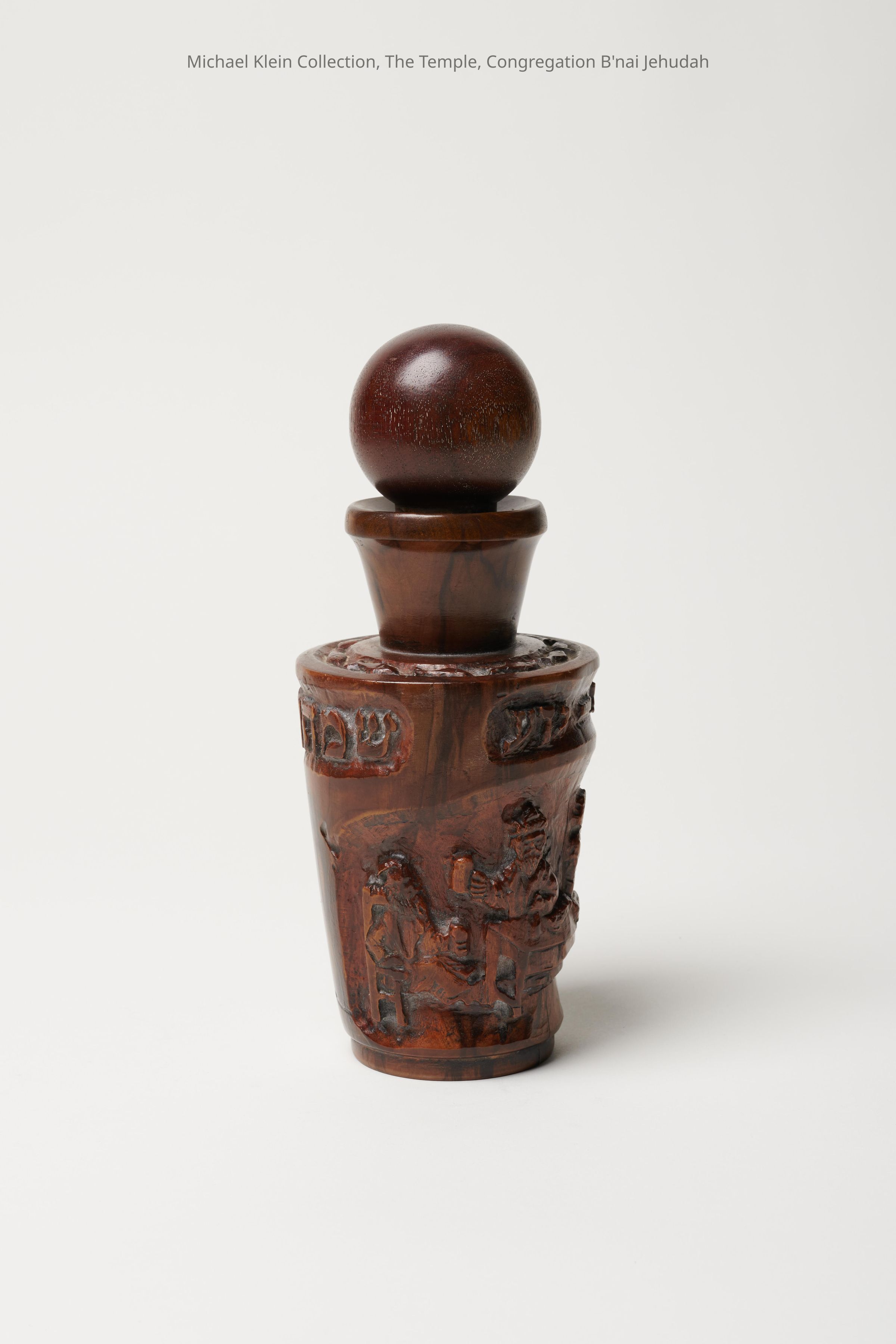 Wooden bottle with round stopper. Engraved festival scene with engraved inscriptions, including "Ad-delo-yadah," or "drink until you don't know the difference between 'cursed is Haman' and 'blessed is Mordechai."Made/Created