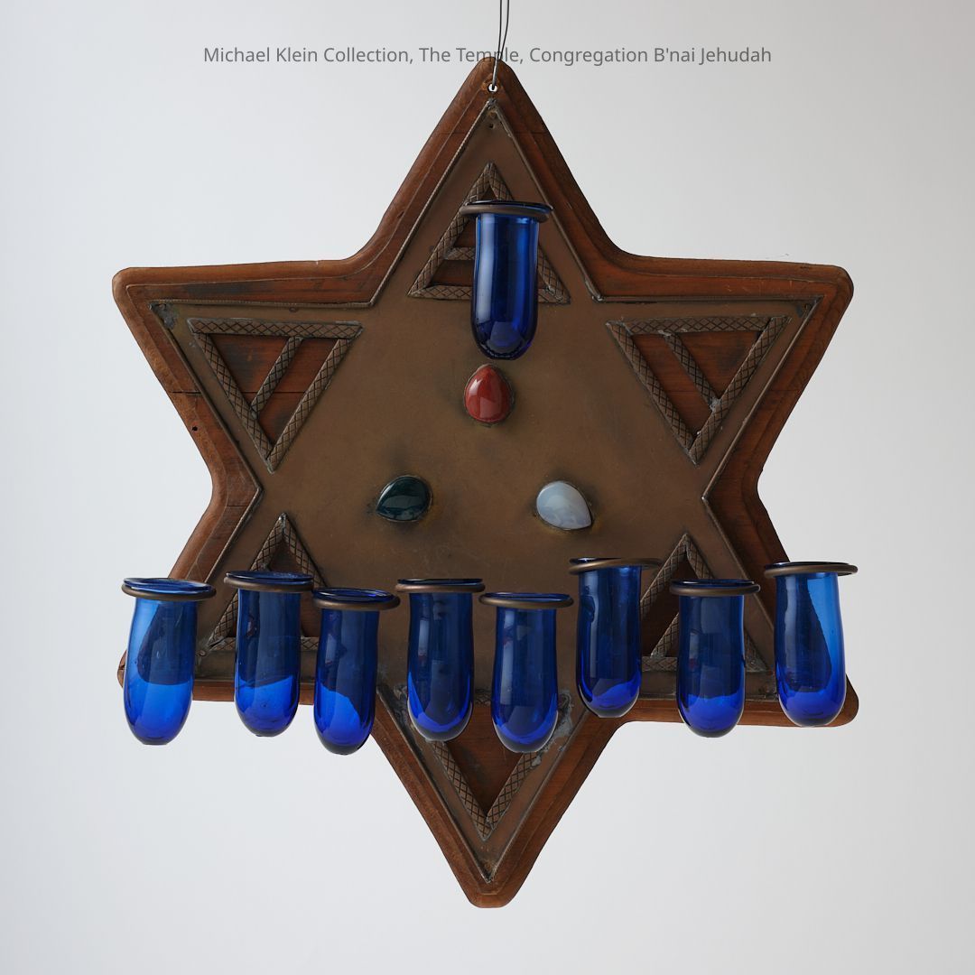 The menorah consists of a large wooden Star of David, on which is placed a copper Star of David, in the center of which are three auspicious stones - green, white and red. In the lower part of the Star of David there are eight rings, in which feet are inserted into the bezikhs. In the upper part there is another ring, at the foot of the sun. On these legs sit purple glass beads.Made/Created