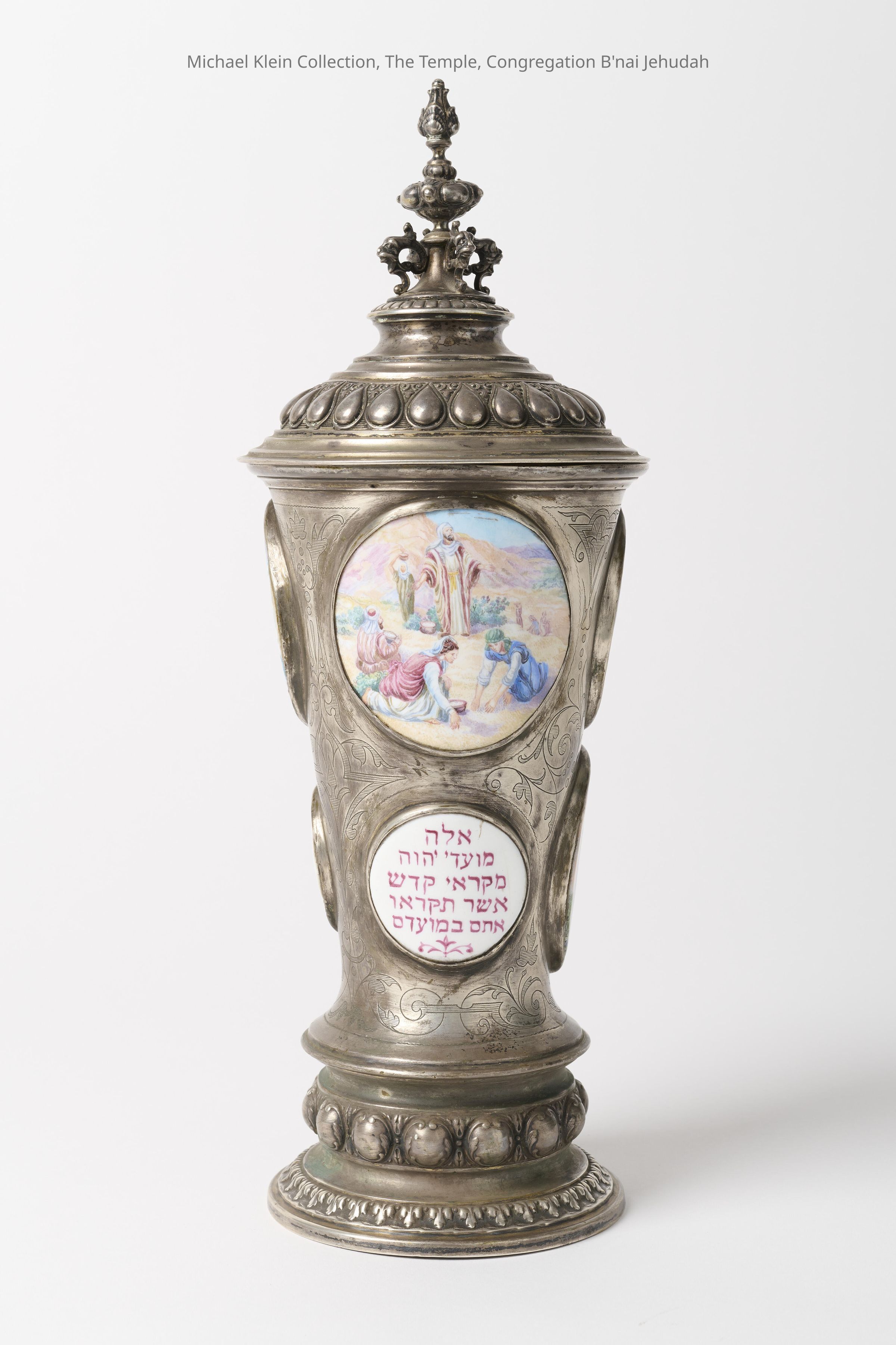 Cup and lid have prominent repousse and engraved decorations. Body of the cup is inlaid with enamel plates held by ringsMade/Created
