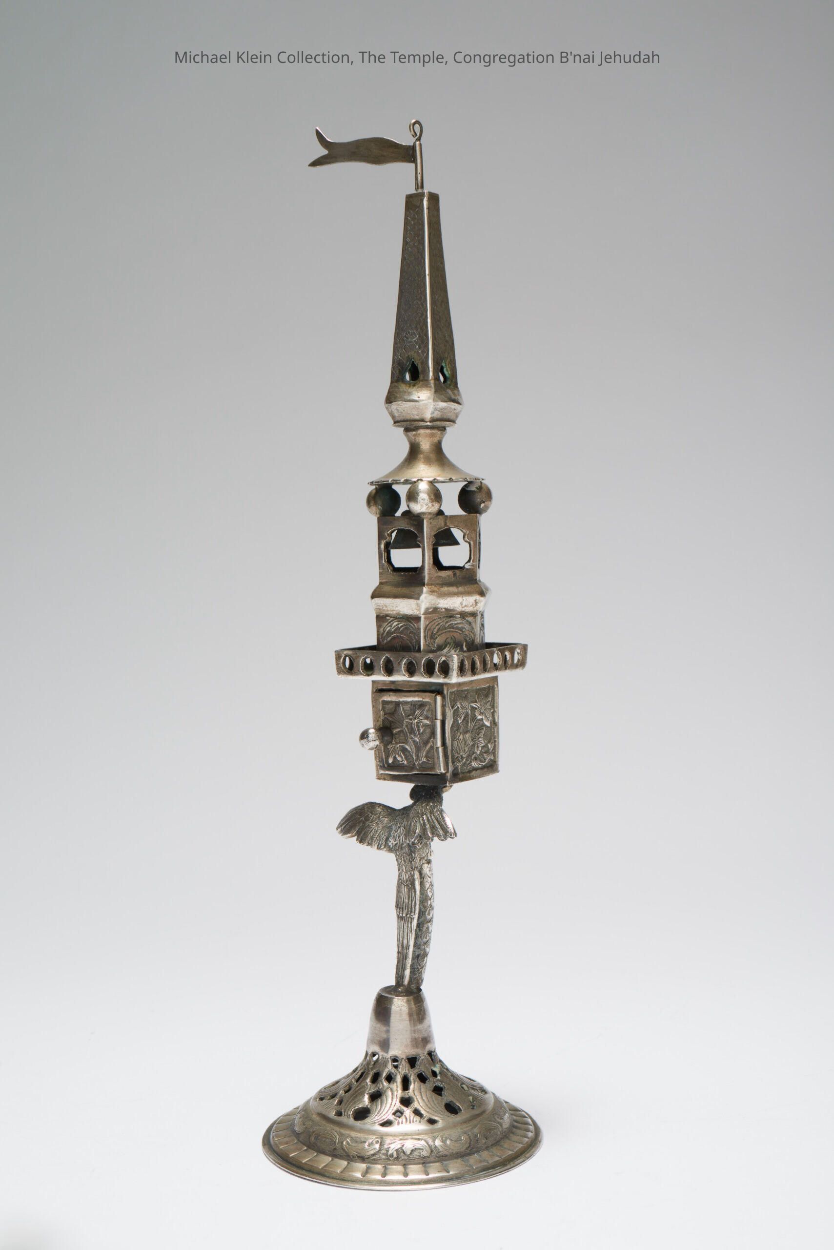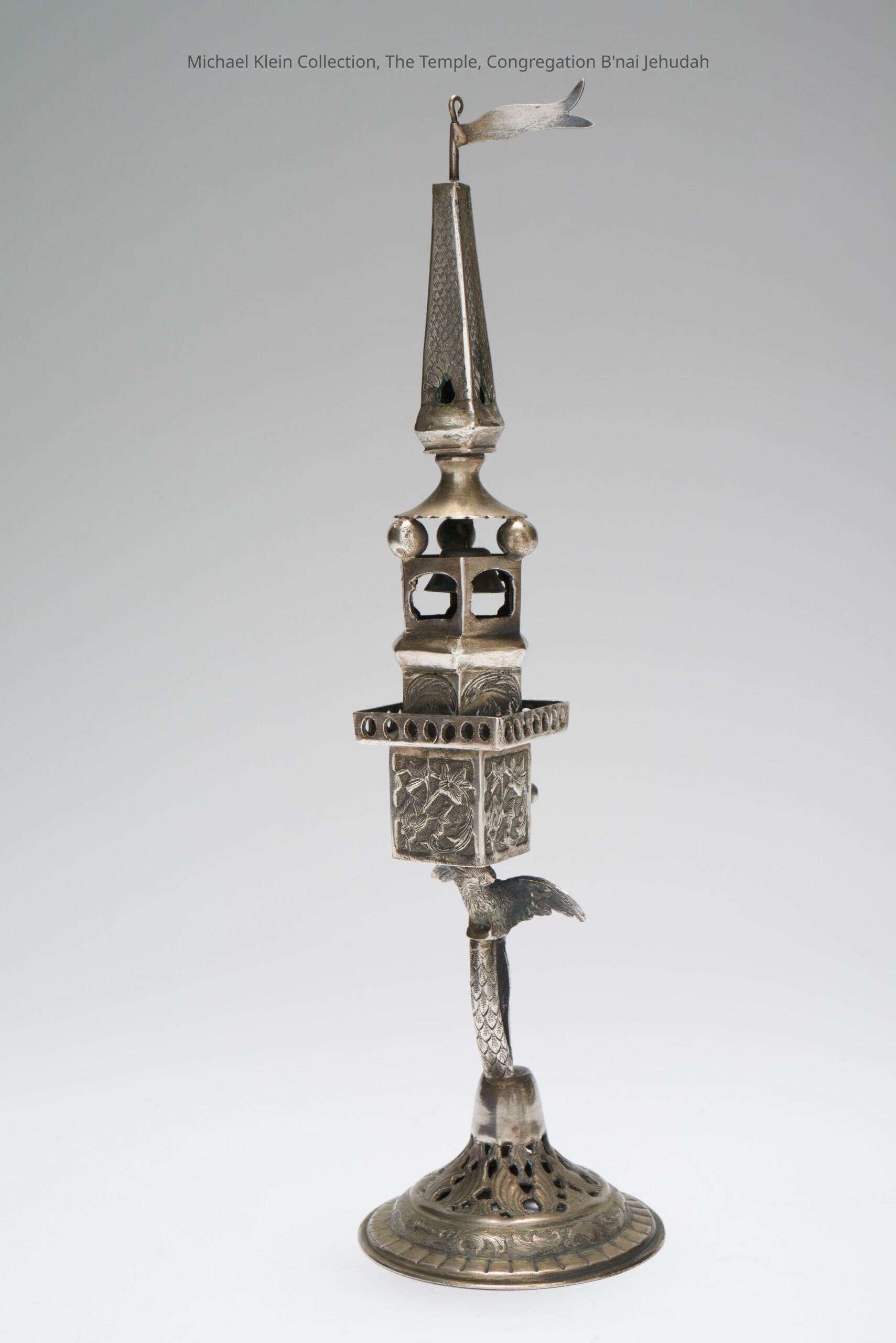 Parrot stem holding up box for spices. Bell tower with flag.Made/Created