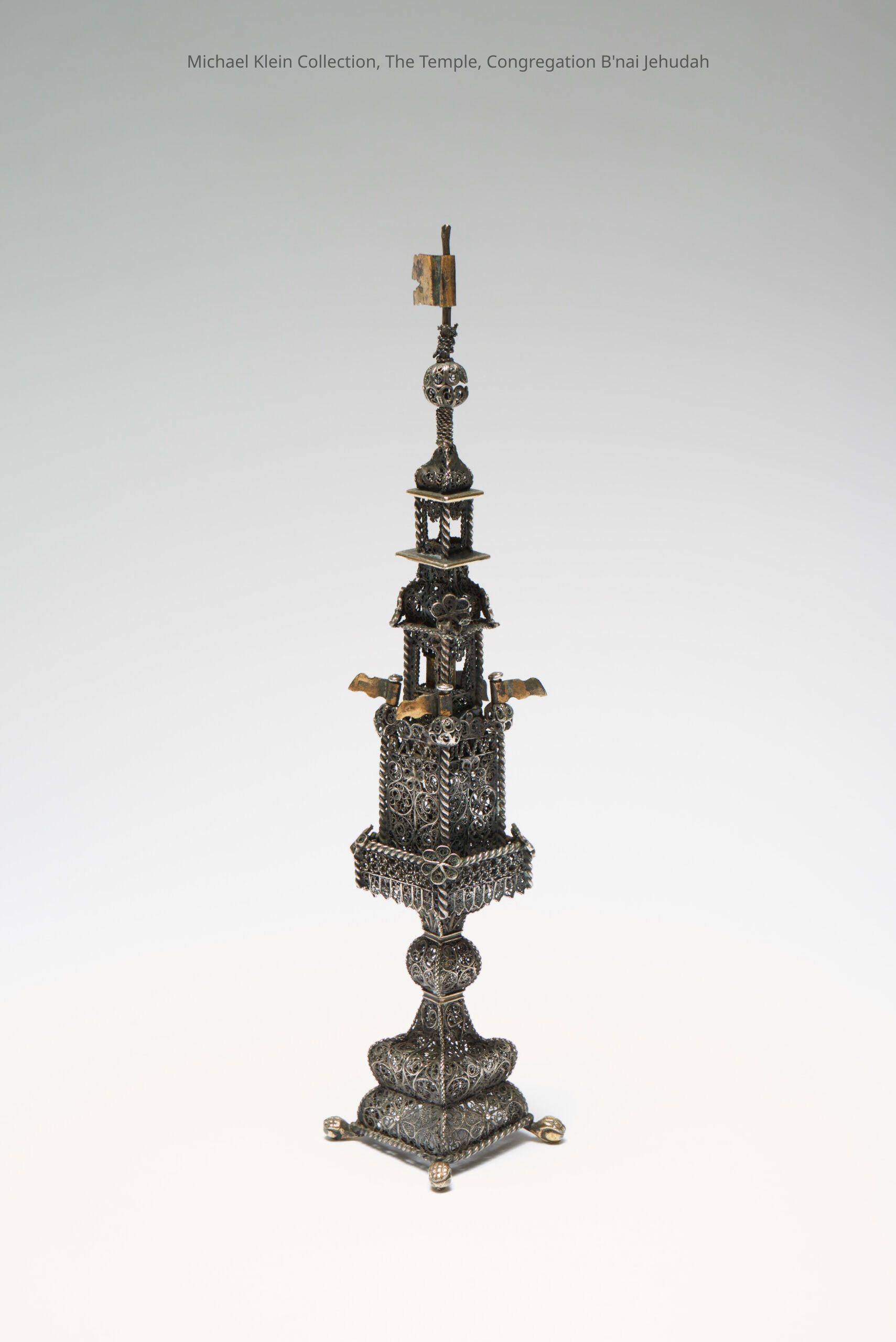 Silver filigree/wire work. Five flag tower. Verified by Chaya Benjamin of Israel Museum. Greenstein says "traditional Lemberg form."Made/Created
