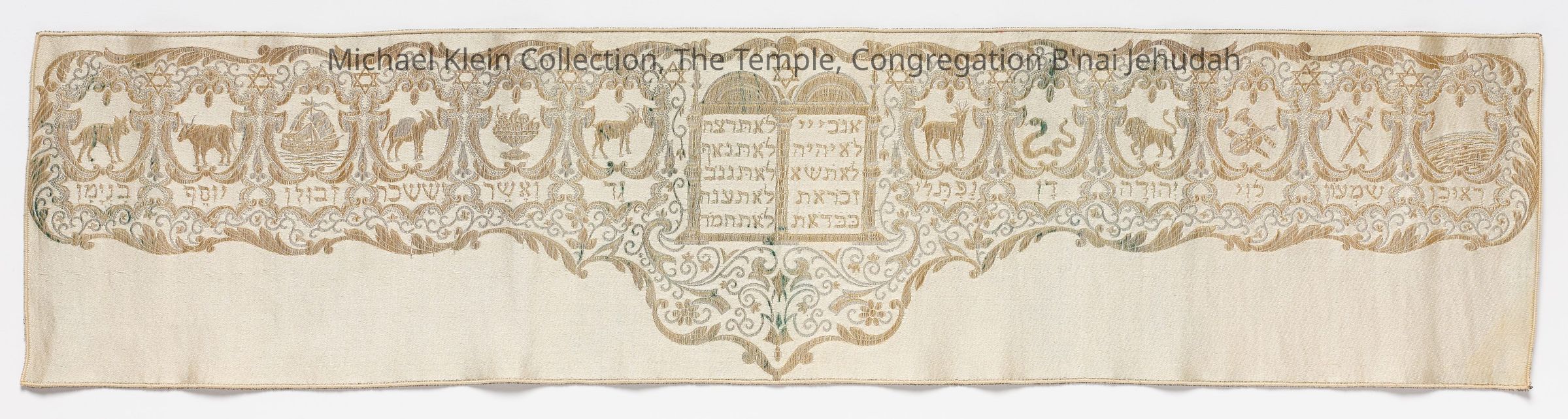 Decorated with gold thread. Depicting scenes of the 12 tribes and the Decalogue. Further decorated with Jewish starsMade/Created