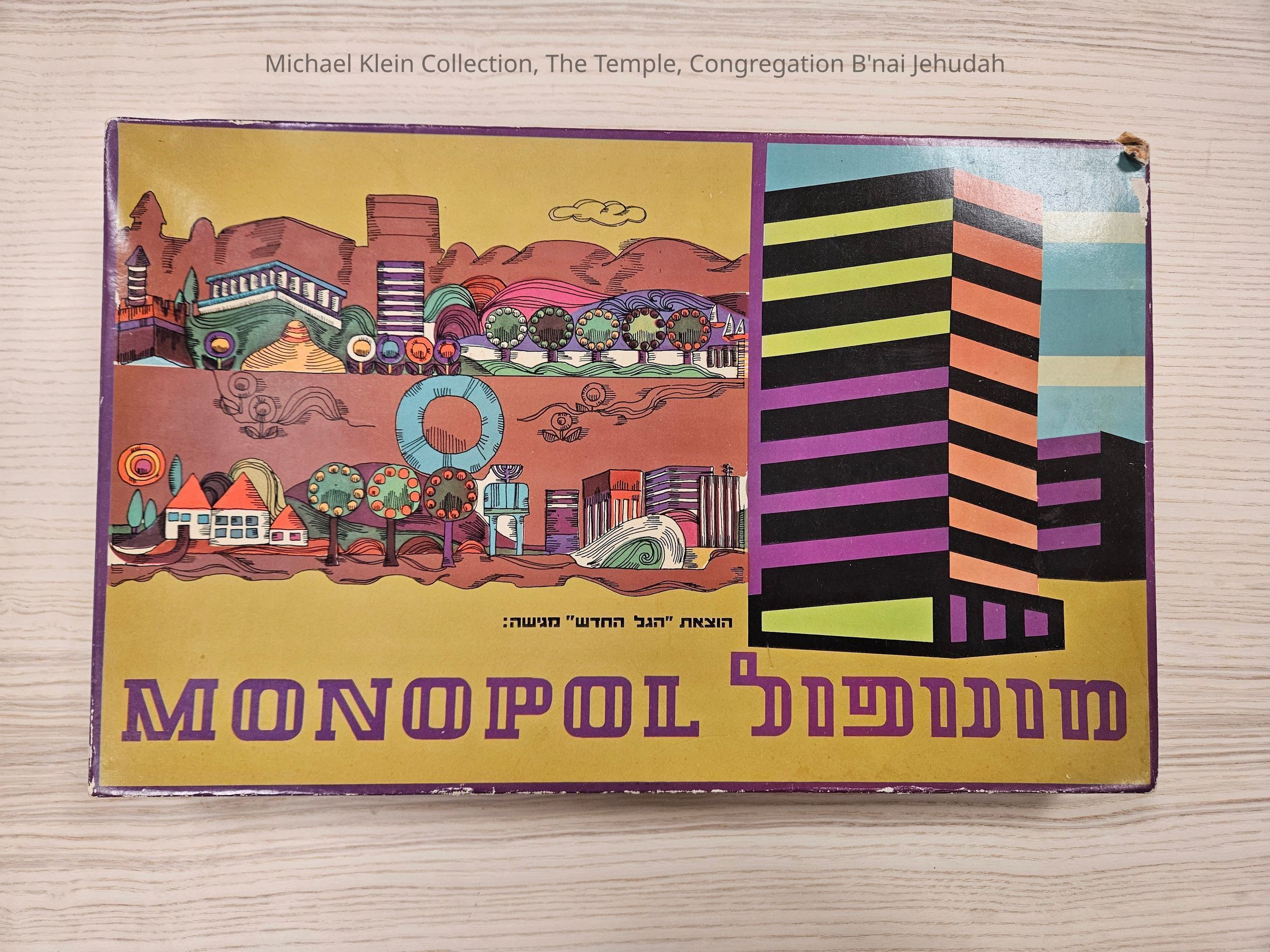 "Monopol" board game is Israeli Monopoly, with all properties replaced with their Israeli equivalents. Hebrew and English text throughout.Made/Created