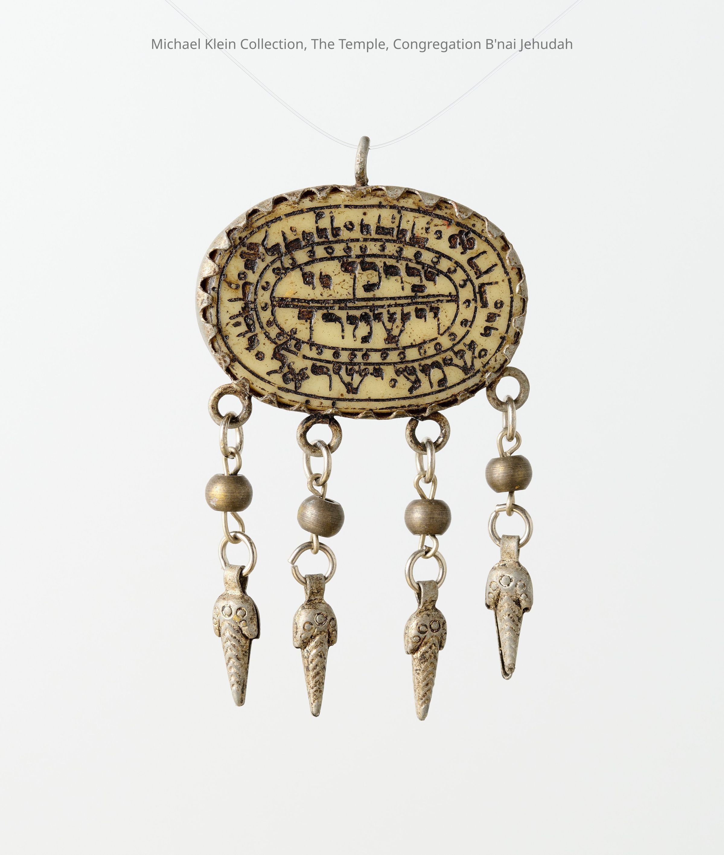A Jewish talisman pendant made of white stone with the holy names in an oval shape decorated with four applications