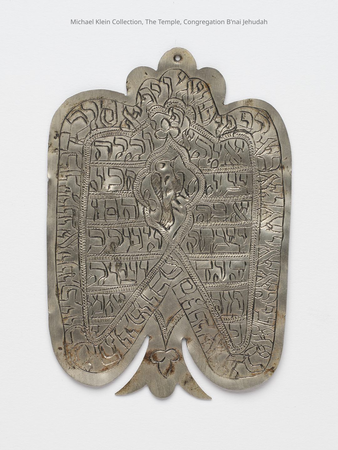 Amulet in the shape of a shield for a baby - prize Amulet in the shape of a stylish shield, for hanging on a cot, Persia, 20th century Decorated with legislative work in the center of a bird, around the names of the patriarchs: Abraham, Isaac and Jacob, Around them are the initials of PsalmsMade/Created