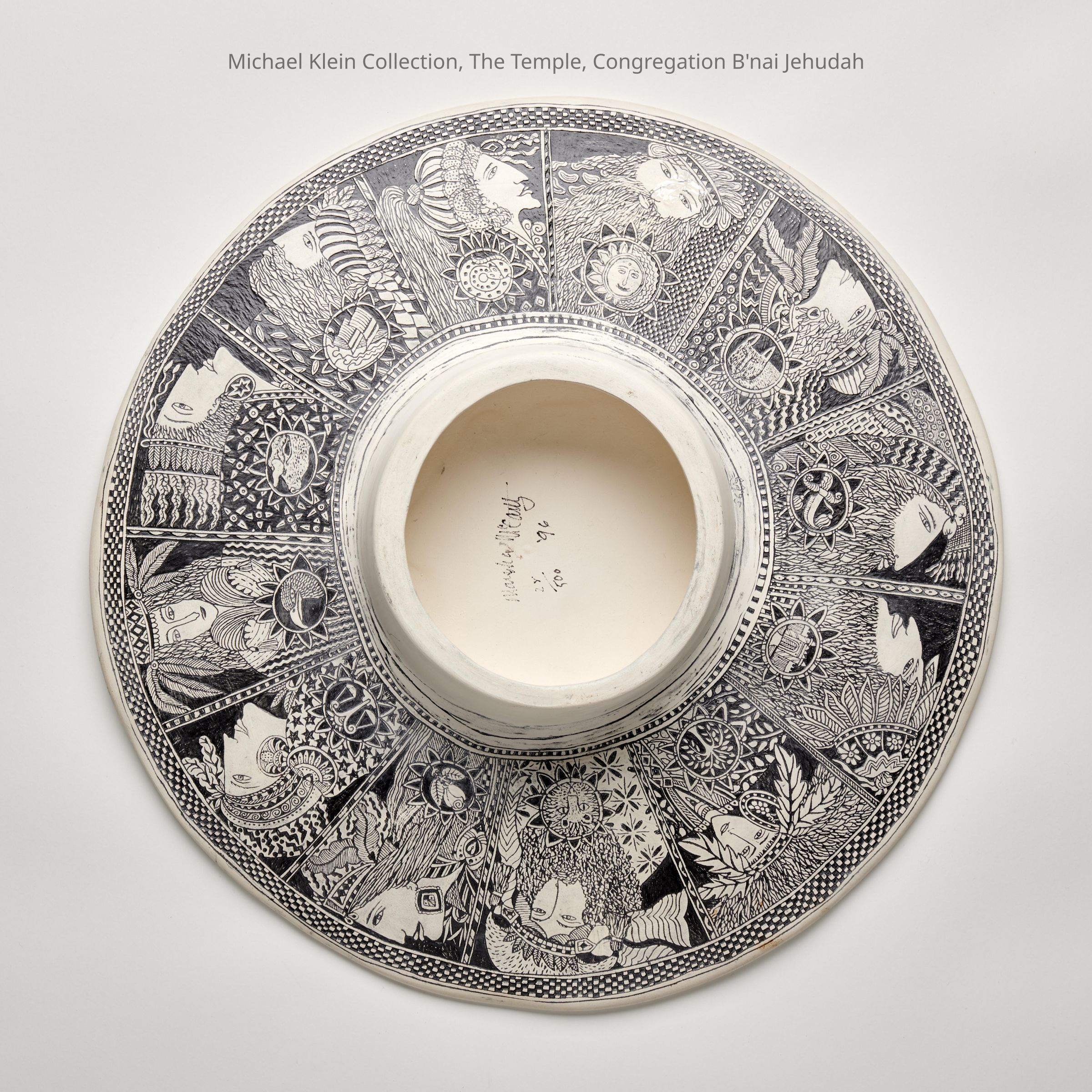 Artist statement: Front: Moses holding the cup of Elijah toward the evening sky to represent the beginning of Passover. The cup holds ten drops of wine representing the ten plagues God wrought upon the Egyptians. Beneath Moses his followers are liberated from Egypt. In the center of the plate surrounding the word 'Liberation' are the four promises made to God to the Israelites: I will bring you out, I will rid you, I will redeem you, I will take you. Beneath the Israelites in an arched frame is a drawing representing Jerusalem: the four children (the wise, the wicked, the simple, and the one who does not know how to ask) and four wine goblets representing the four promises. In the center is a lighted candle to signal the start of Passover. The border of the Seder Plate is divided into six sections in the shape of the Star of David. Each section contains one of the ceremonial foods.... Other design elements used are taken from the seven species: wheat, barley, pomegranate, dates, olives, grapes and figs. The back of the plate is divided into twelve sections. Each depicts one of the twelve ancient tribes of the Israelites with the appropriate symbol used by that tribe.Made/Created