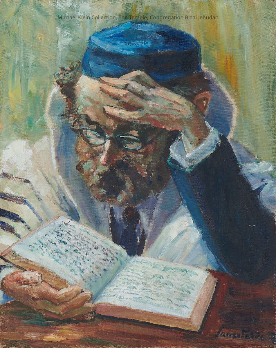 Dan born in Bucharest, 1903. Appointed court painter to Carol II, King of Romania. Survived Bergen-Belsen camp. Immigrated to Israel 1961, moved to Germany until death in 1986. Image of man with kippah and tallis, glasses and necktie, studying book.Made/Created
