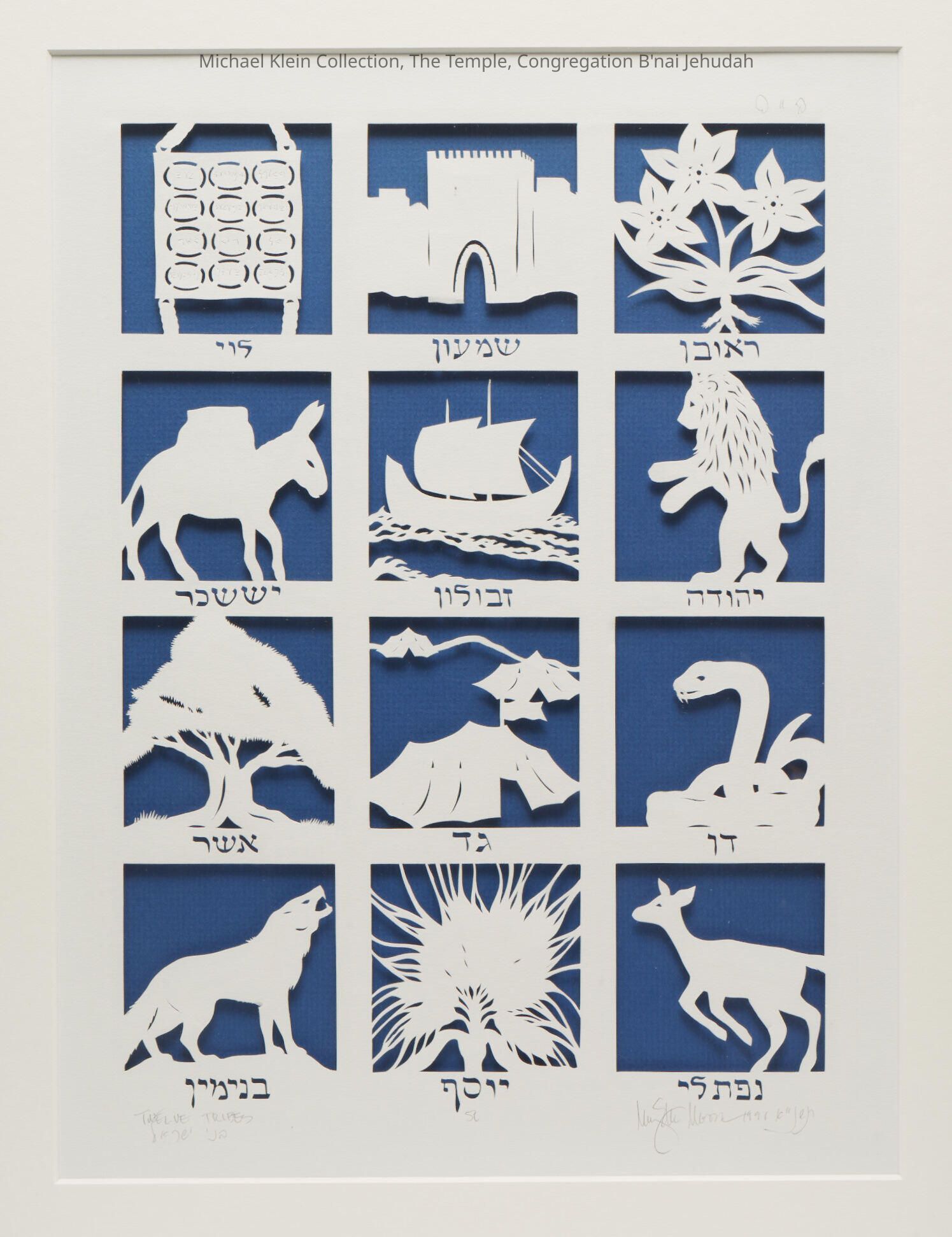 Cut white paper on blue background. Twelve boxes, each with symbol for the Twelve Tribes of Israel.Made/Created