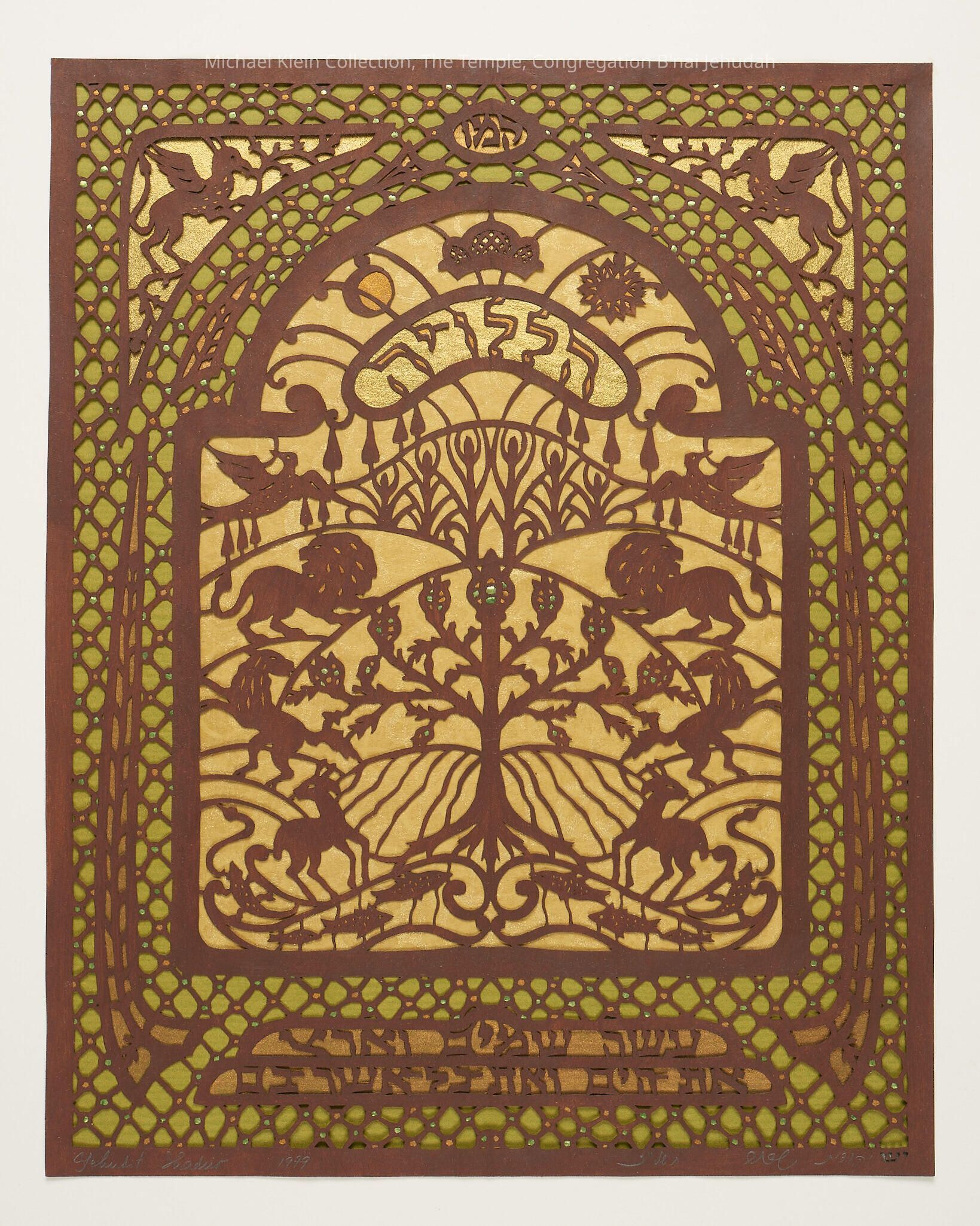 Brown paper cut with green and tan paper beneath. "Hallelujah" and image of tree with animals. Border on all four sides, cut script of Psalm 146, verse 6 at bottom.Made/Created