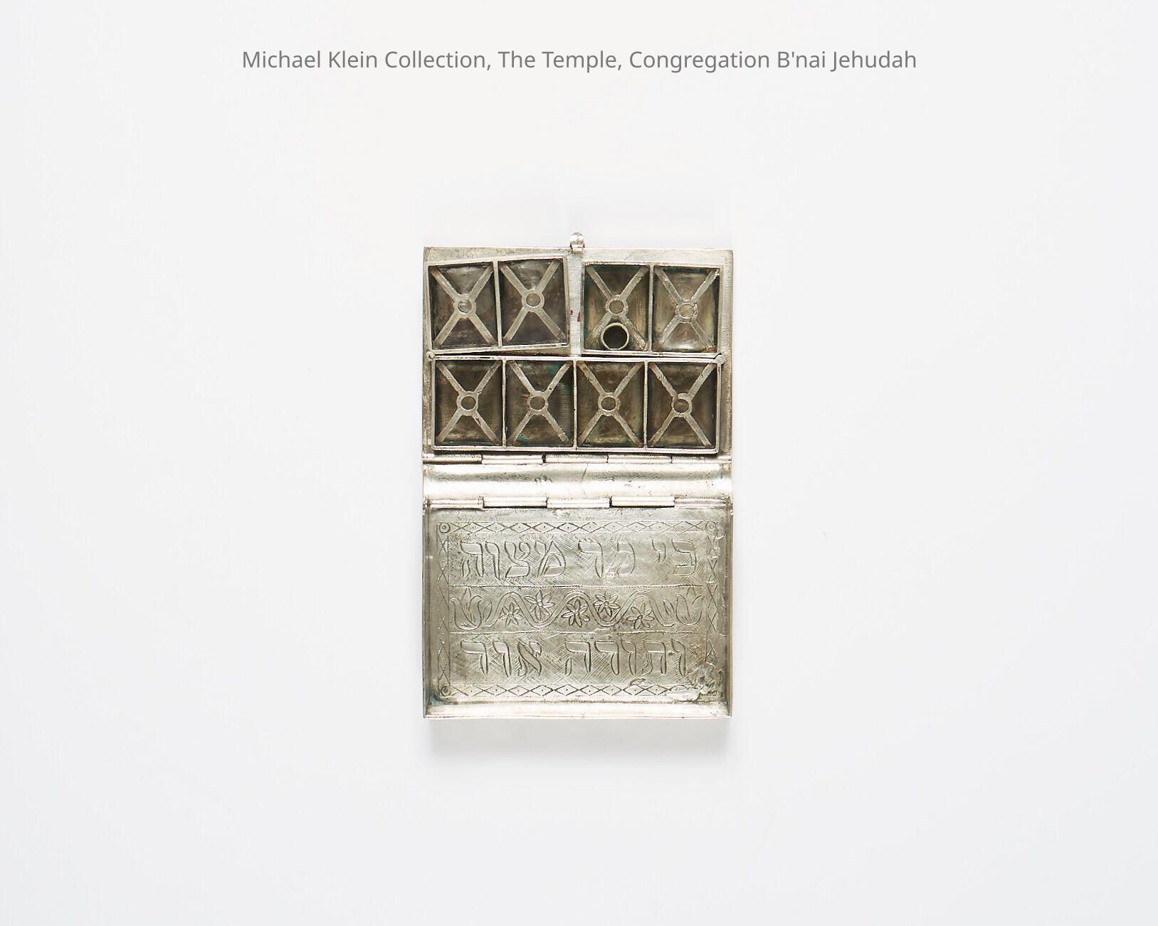 Continental silver "Traveling" hanukah lamp. Book form. The covers pierced and engraved with menorahs flanked on one side by a pair of deer and the other by a pair of birds among flowering foliage, the spine with Hebrew inscription, the interior with rectangular lamps hinged to extend, the interior of the cover with Hebrew inscription spaced by flowers on hatched ground.Made/Created