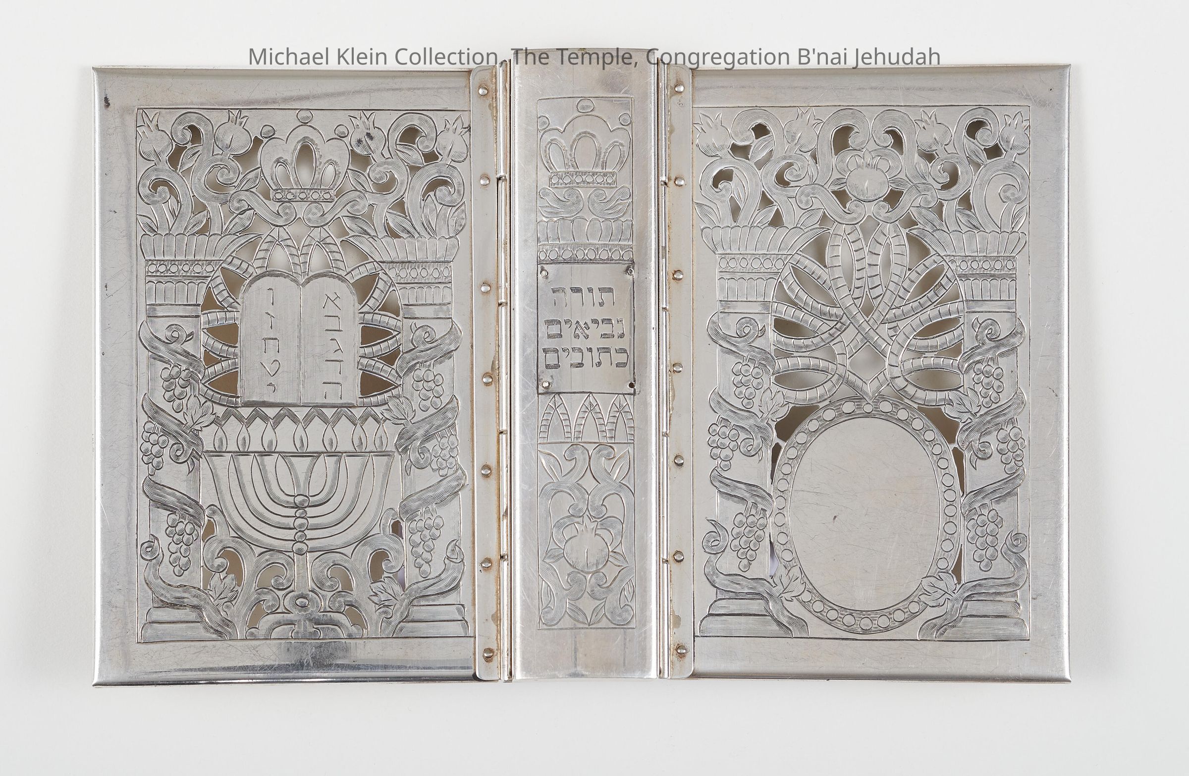 In form of papercuts. One cover features tablets, menorah, columns and a crown. Back cover features columns and open space for personal engraving (blank). Spine reads "Torah, Nevi'im, Ketuvim"Made/Created