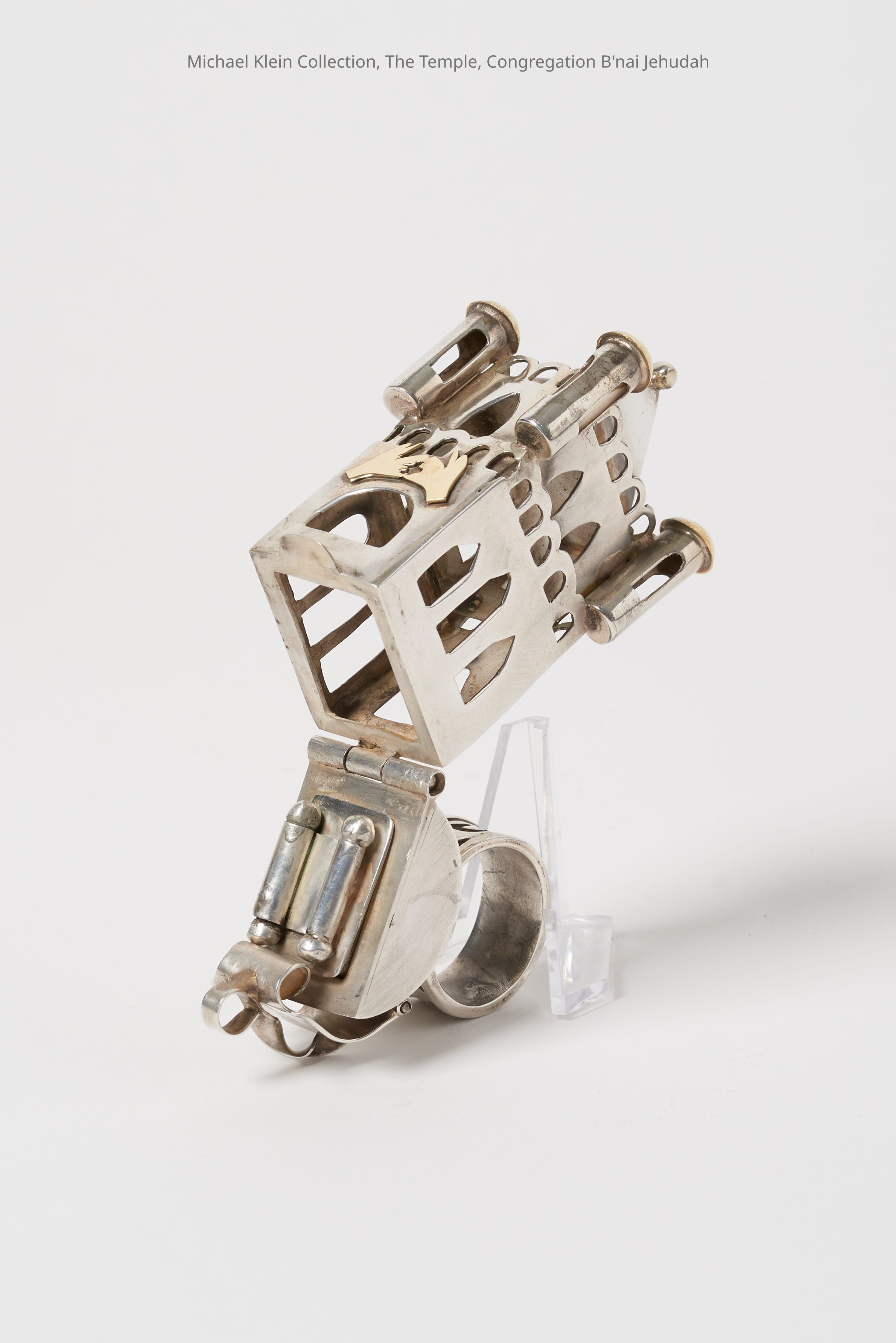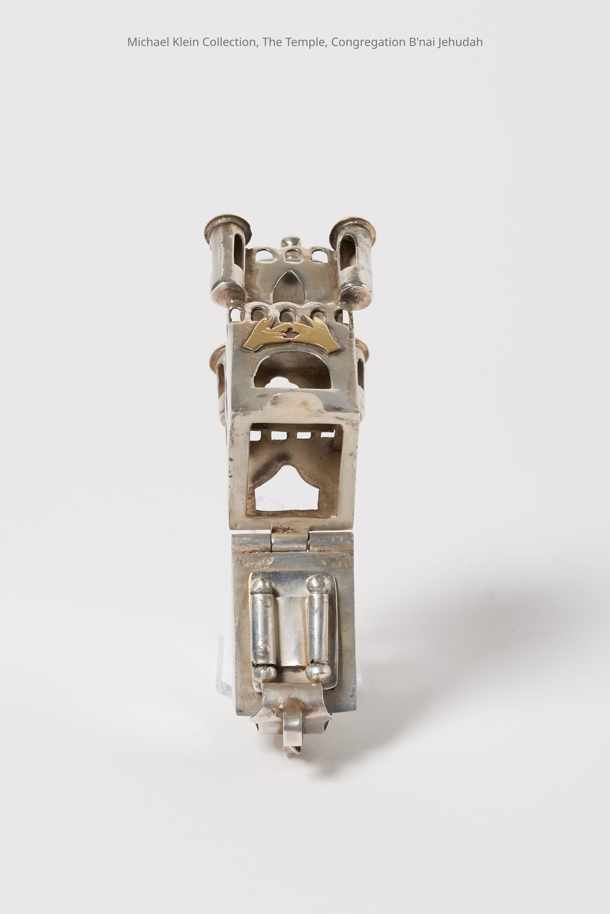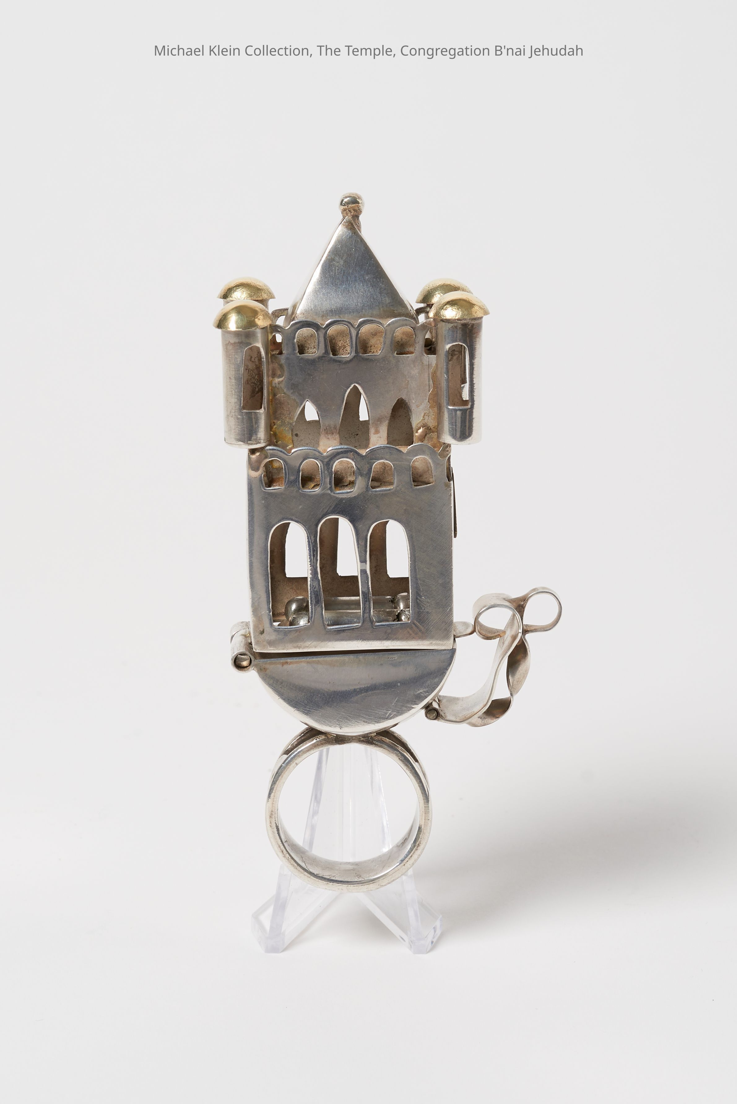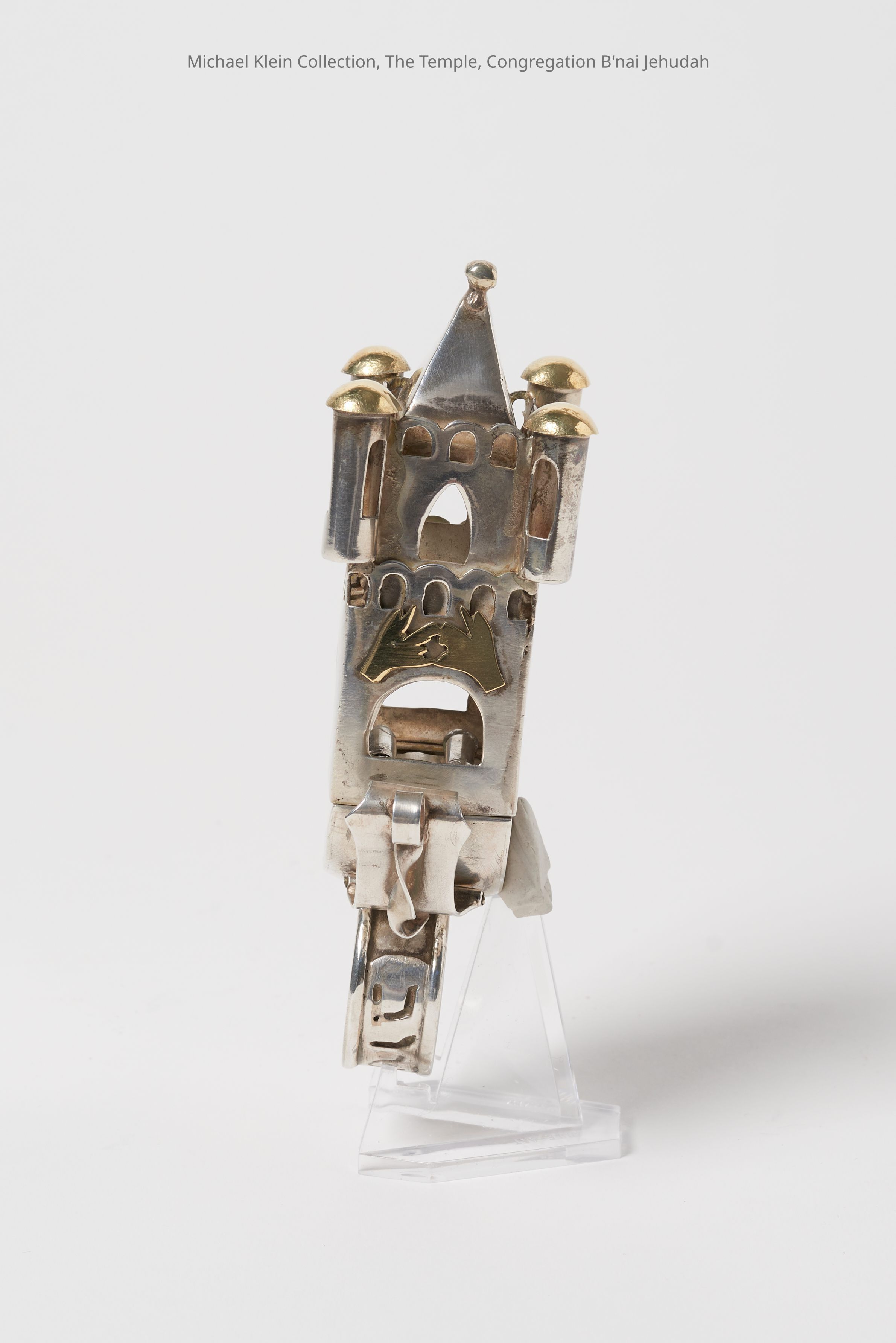 Castle shape. "Mazel tov" on ring. Kohen hands on side. Removable scroll inside; probably a compartment for spices.Made/Created