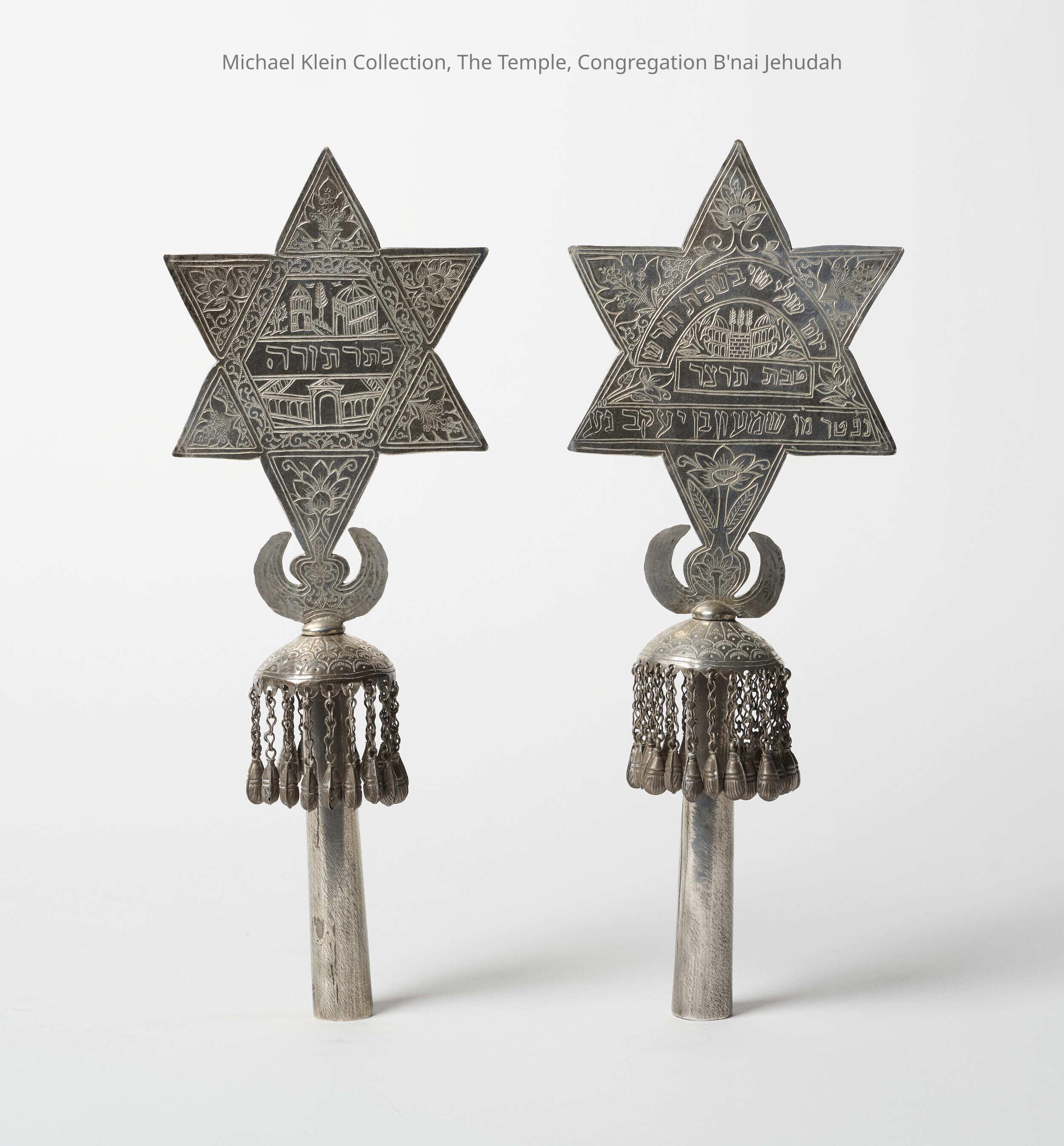 Each of these "Torah crowns" is surmounted by a large, flat Star-of-David ornament decorated in vegetal patterns. The center of each Star of David forms a hexagonal frame with encloses, on one side of each finial, illustrations featuring domed buildings above and below a central horizantal band bearing the Hebrew inscription "Keter Torah" ("Torah Crown"), and on the other side, the Hebrew dedicatory inscription "On the third day of the week, the month of Tevet 5694 [1934], Shimeon son of Ya'akov, may he rest in Eden, passed away" alongside illustrations depicting the Western Wall. At the base of each Star of David is a crescent-shaped ornament over a dome, with chains bearing pendant bells suspended from its rims. Long, hollow cylindrical shafts.Made/Created