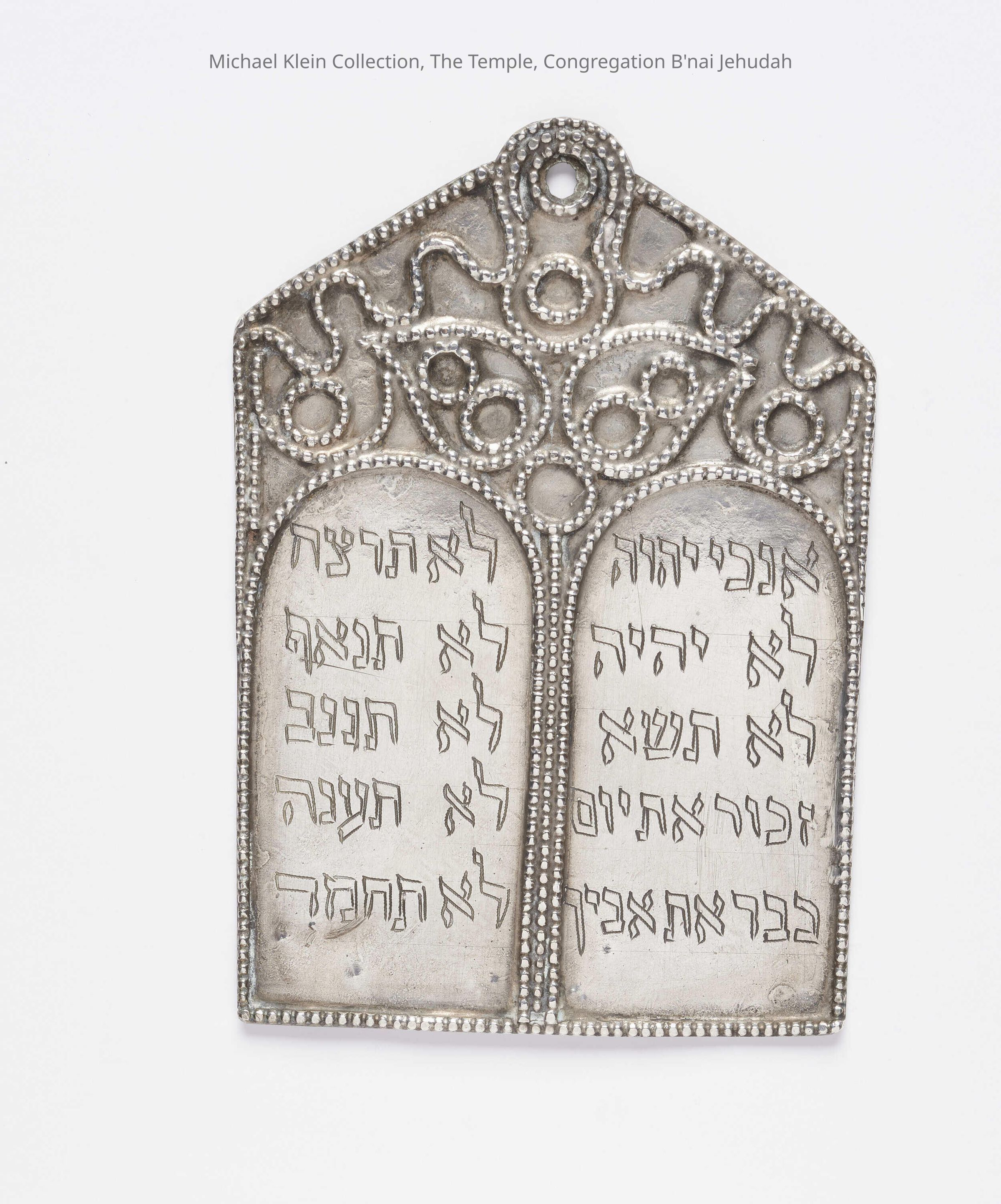 Designed as Tablets of the Law, engraved with Ten Commandments, and surmounted with ornaments in silver thread and granulation with suspension hole. Engraved Hebrew dedicatory inscription on back: "This plaque is dedicated to the synagogue by Hananiyah son of Varda, 5699 [1939]...".Made/Created