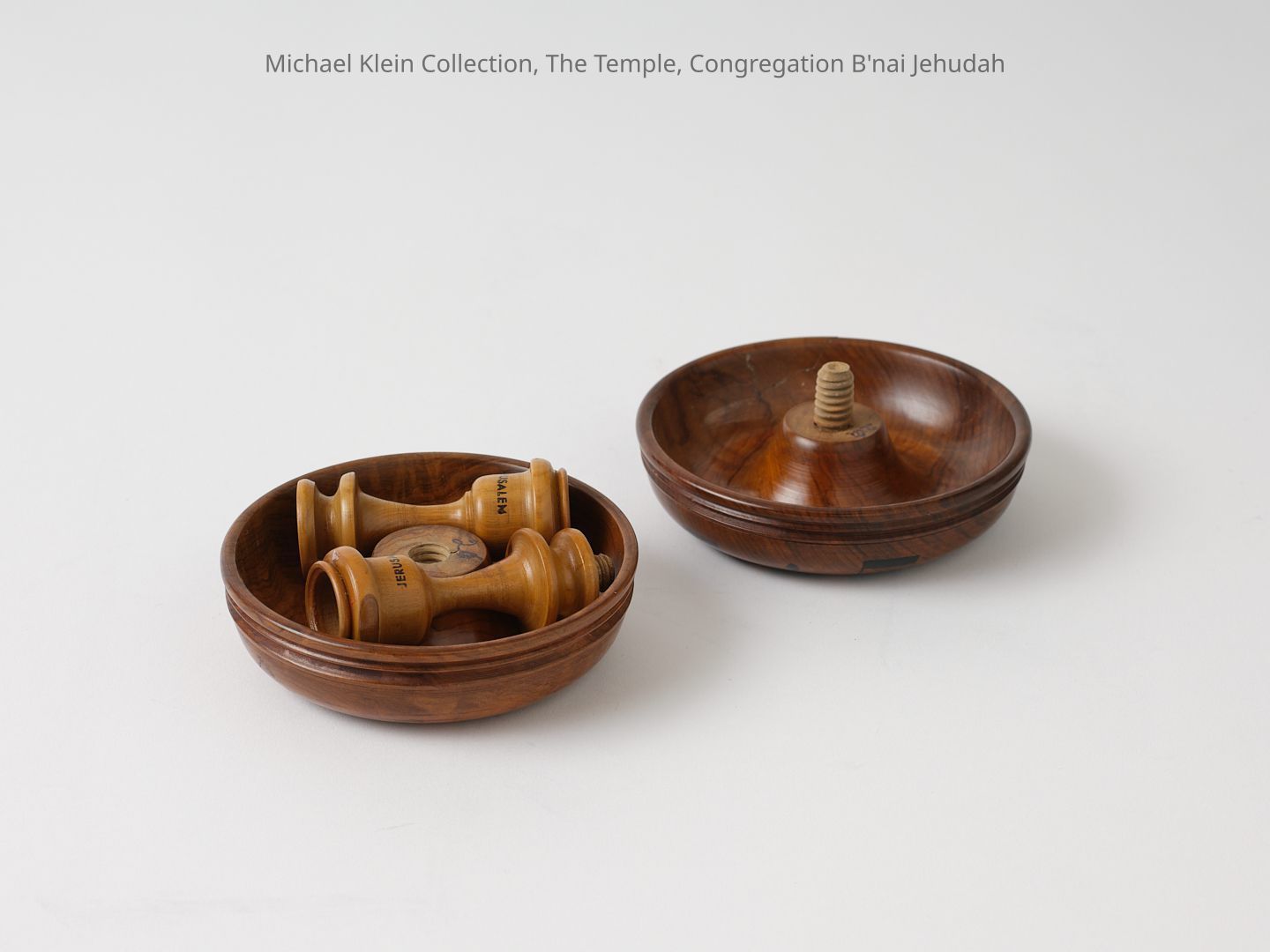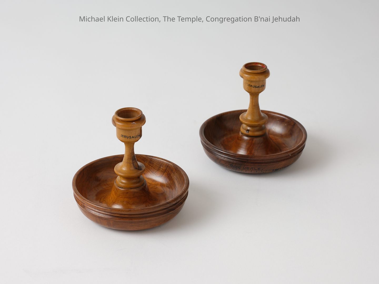 A pair of travel candlesticks made of olive wood, early 1920s, decorated with the inscription "Jerusalem" with an illustration of the Western WallMade/Created
