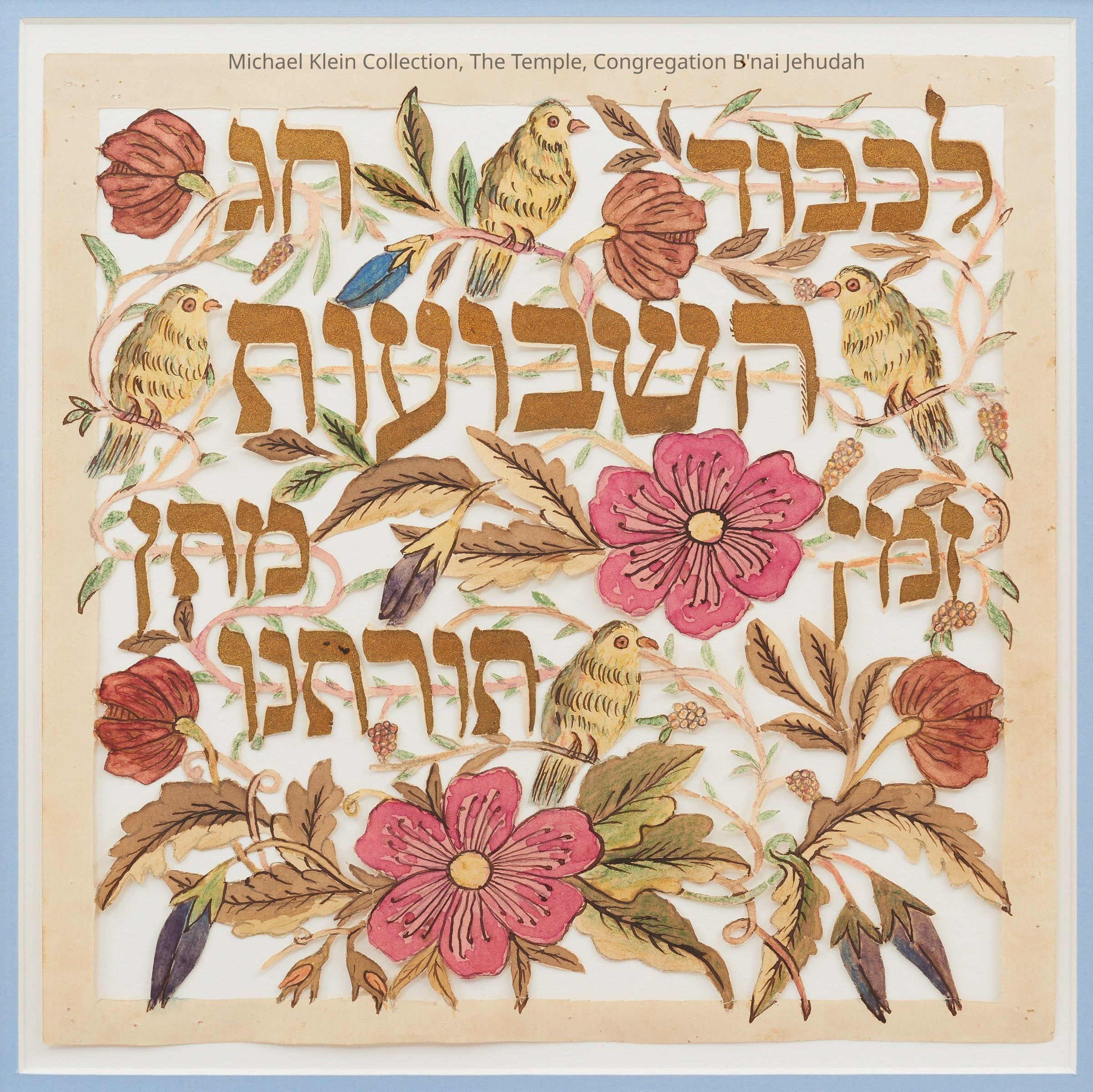 The papercut revolves around the (Hebrew) words "In Honor of the Holiday of Shavu'ot, Festival of the Giving of the Torah" in large gilt letters. Surrounding the letters and intertwined within them are slender branches bearing flowers, buds, and leaves. Birds are perched on the branches. Inscribed (in Hebrew) on the back of the papercut: "Made in 5674" = 1914.