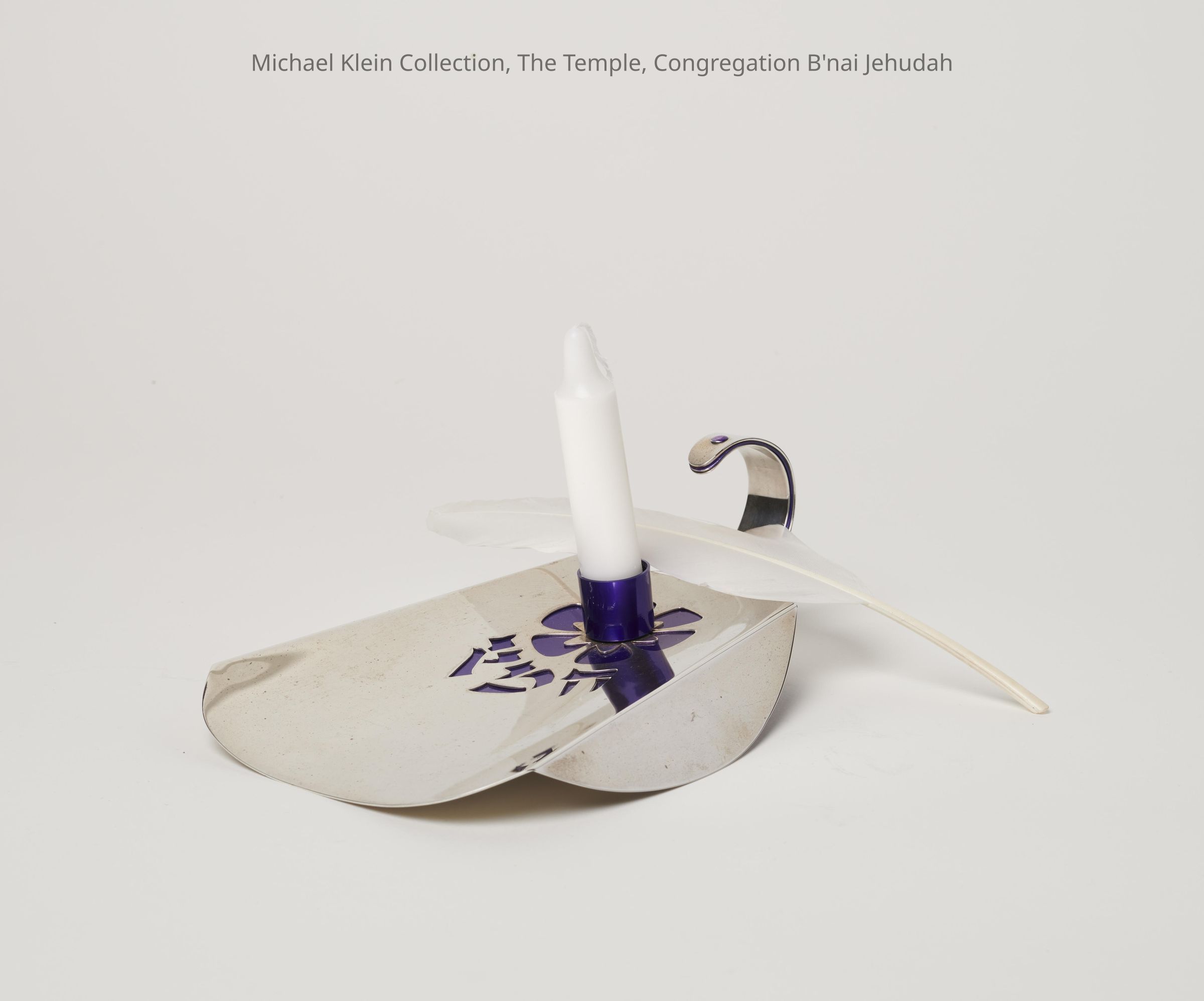 In the form of a dustpan. Feather to sweep up chametz; candle holder.Made/Created