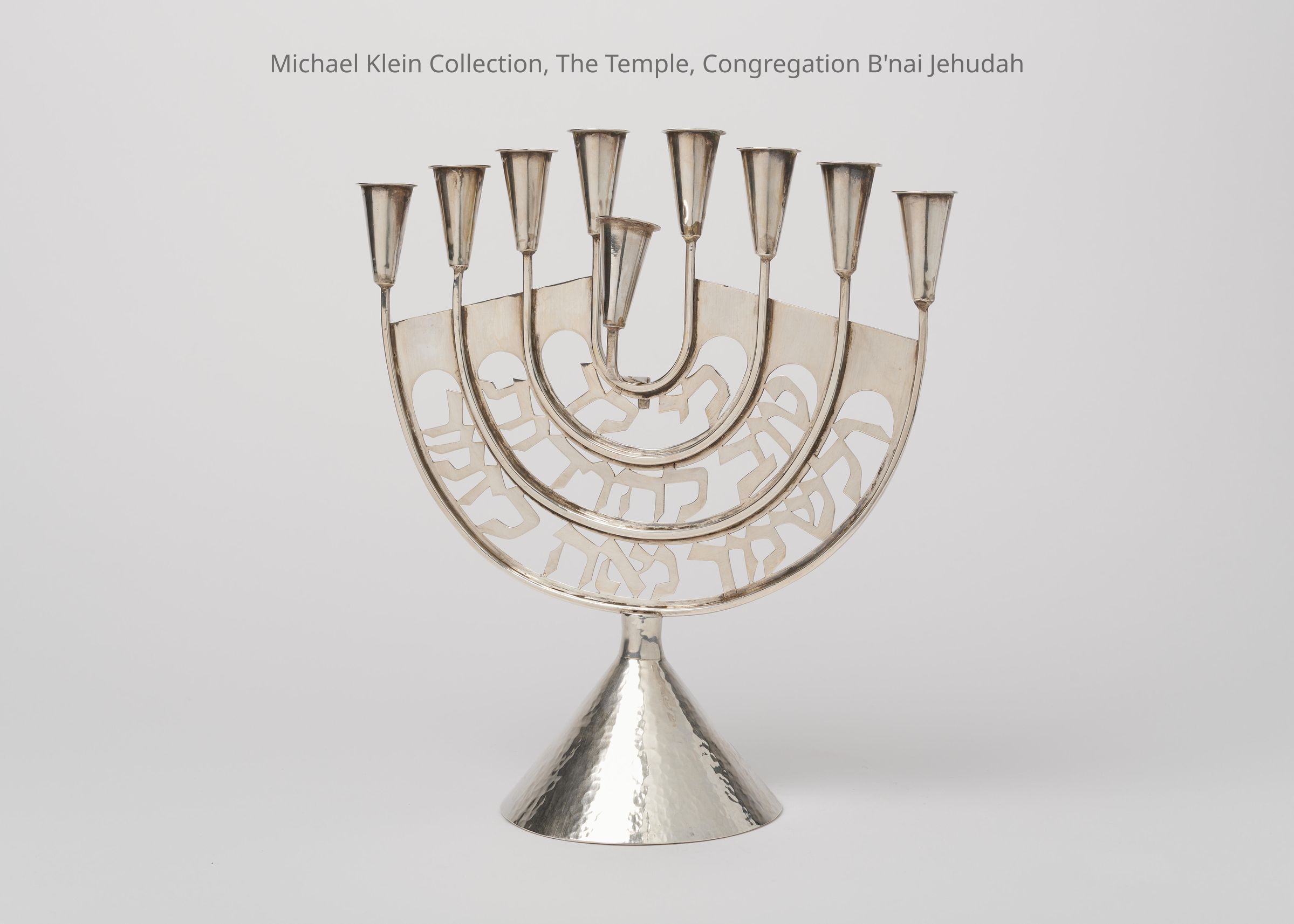 A special, high quality silver menorah designed and made by the silversmith David Heinz Gumbel, one of the first and most important modern Judaica artists of our generation, and a teacher at the Bezalel Academy of Arts and Crafts. On the back of the menorah, in the lowermost portion, Gumbel stamped his name in Hebrew.Made/Created