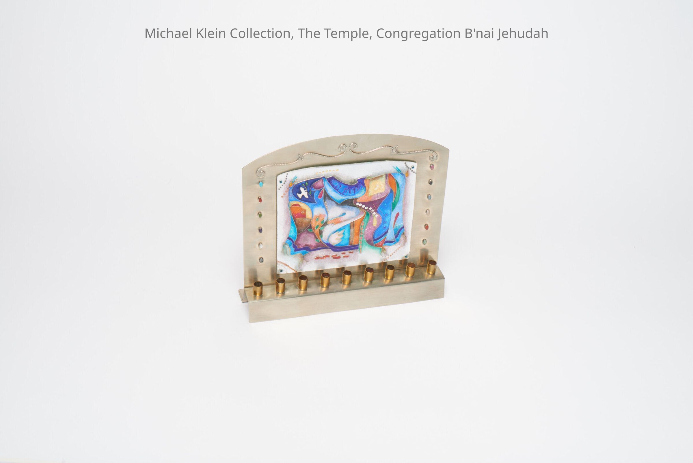 Cloisonne enamel on silver. Stones represent the 12 tribes. Teardrops represent Hannah and seven sons' martyrdom. Dove of peace=triumph of maccabees. Wings: an Angel appeared on the sixth day of battle to encourage the weary warriors. Seven leafed branch and seven gold squares=days of the secular week. Eight stones: continuity of the number of days celebrating Chanukah, stones live forever as will the observance of this holiday. Temple glowing in its purified, revitalized rebirth after the revolt. The composition is enclosed in a Tallit, for although Hanukkah is not a Biblical holiday, I [artist] think of it as being separate from the mundane, as the Tallit separates the spiritual from the secular. Marian Slepian, 5 Overlook Drive, Bridgewater NJ 08807-2105 908-231-6667Made/Created