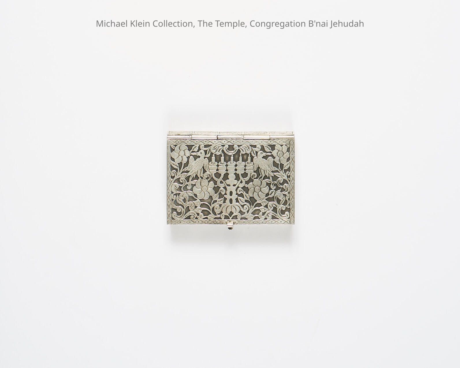 Continental silver "Traveling" hanukah lamp. Book form. The covers pierced and engraved with menorahs flanked on one side by a pair of deer and the other by a pair of birds among flowering foliage, the spine with Hebrew inscription, the interior with rectangular lamps hinged to extend, the interior of the cover with Hebrew inscription spaced by flowers on hatched ground.Made/Created