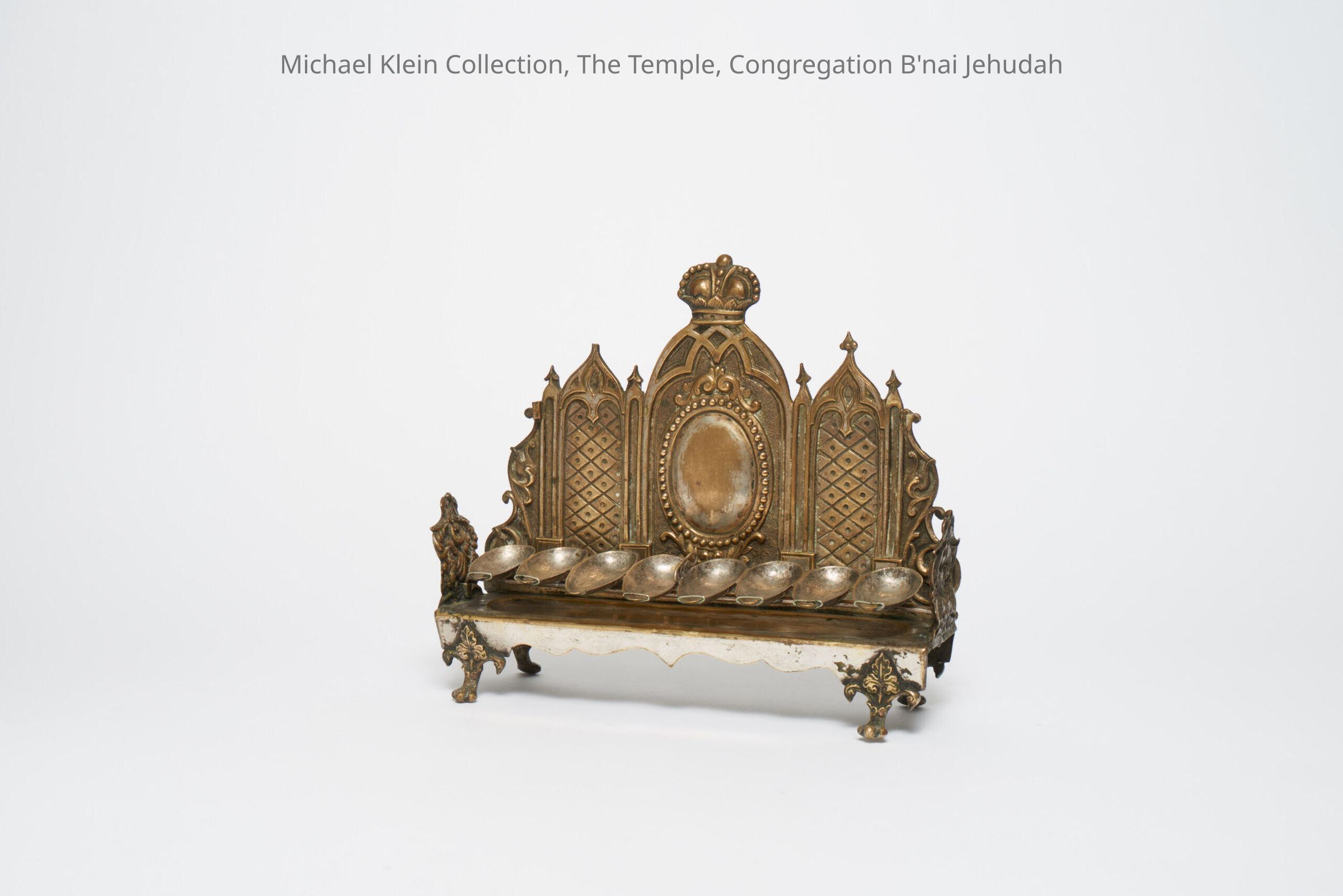 Gothic style. "Spoon" oil burners. Crown on top. Architectural design. Center panel featuring oval plate, no inscription.Made/Created