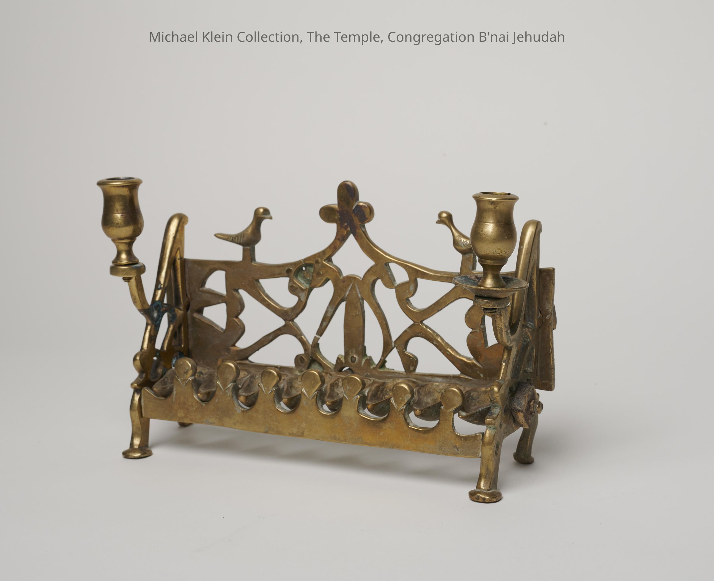 2 Shabbat candles at left and right, one missing its drip pan. Birds on top of back panel.Made/Created