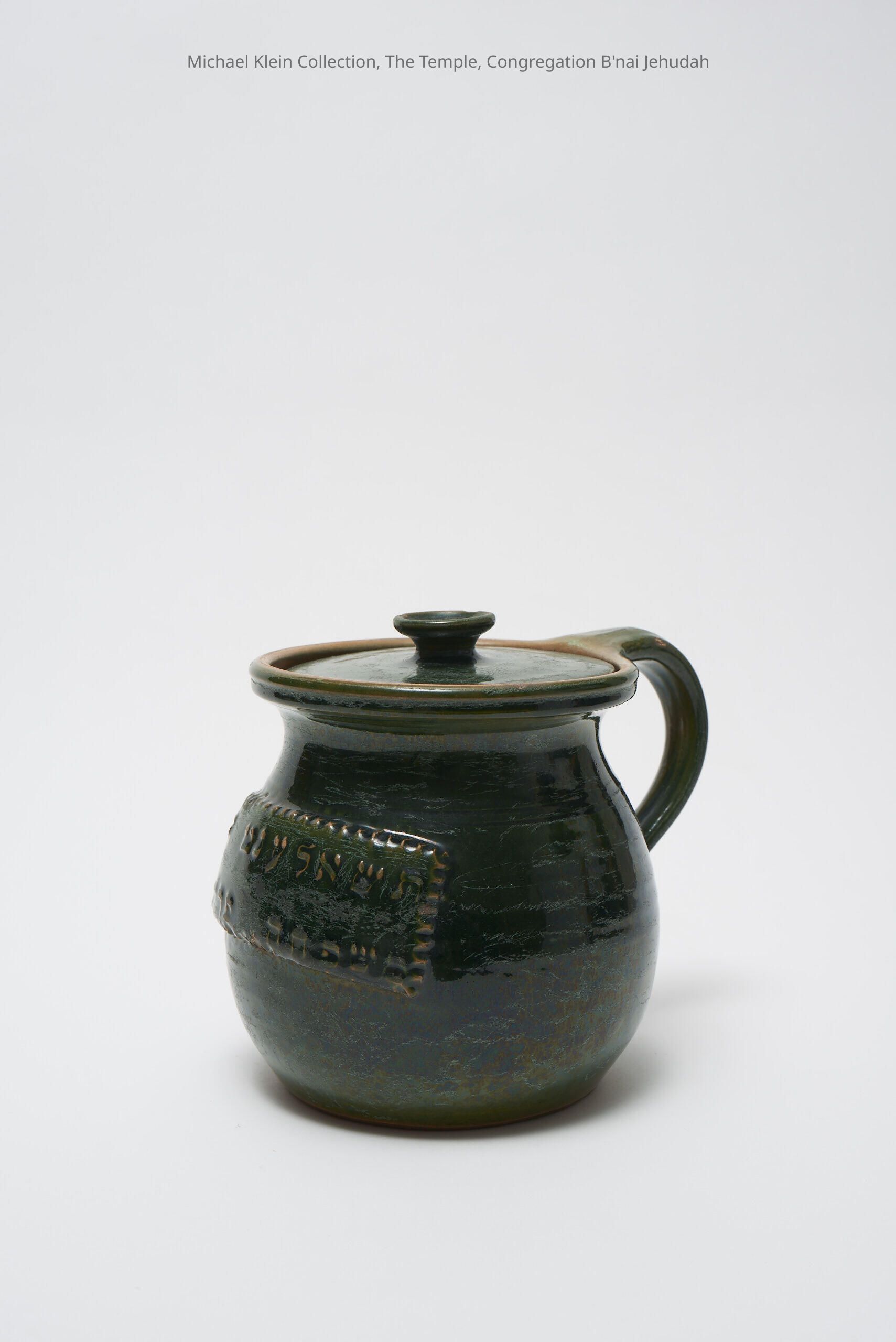 Yiddish text: "Cholent pot for the Perles Family" Dark green glaze