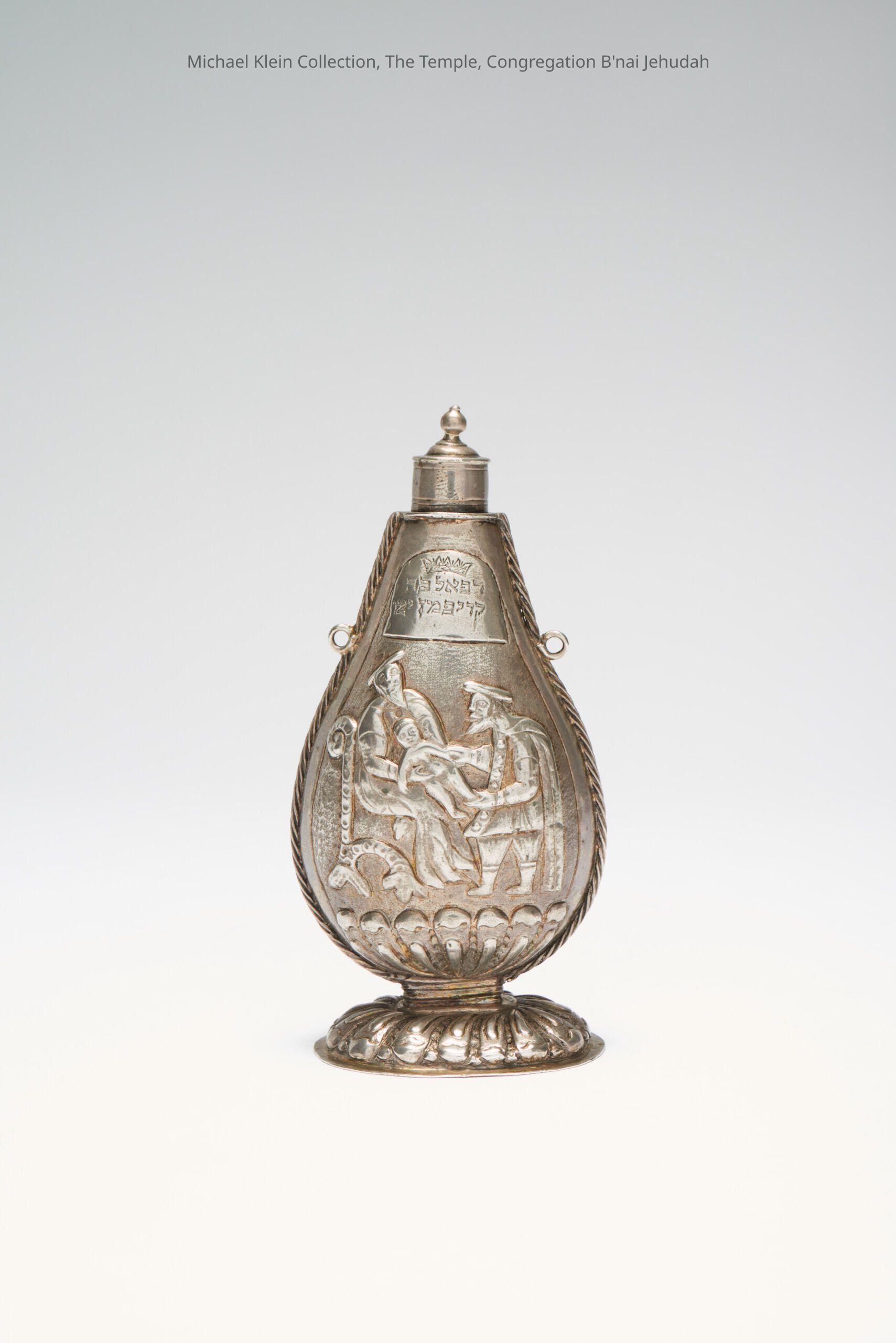 This silver flask for astringent powder is decorated with chased scenes relating to the circumcision ceremony. It is engraved with a Hebrew dedication to Raphael Son of Kavifman, text for "And Your Brit Should Be for Brit Forever," and the date of 1744.Made/Created