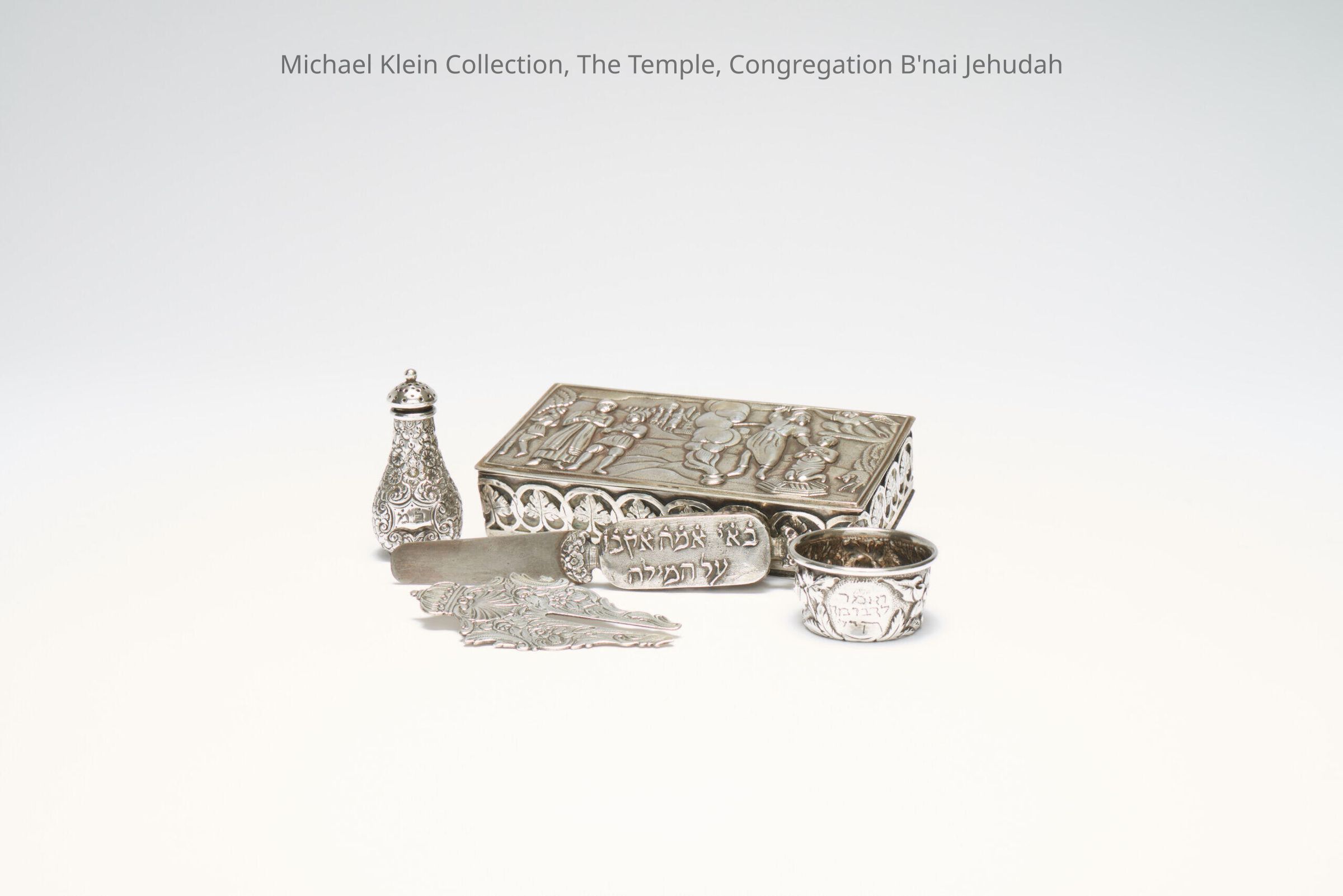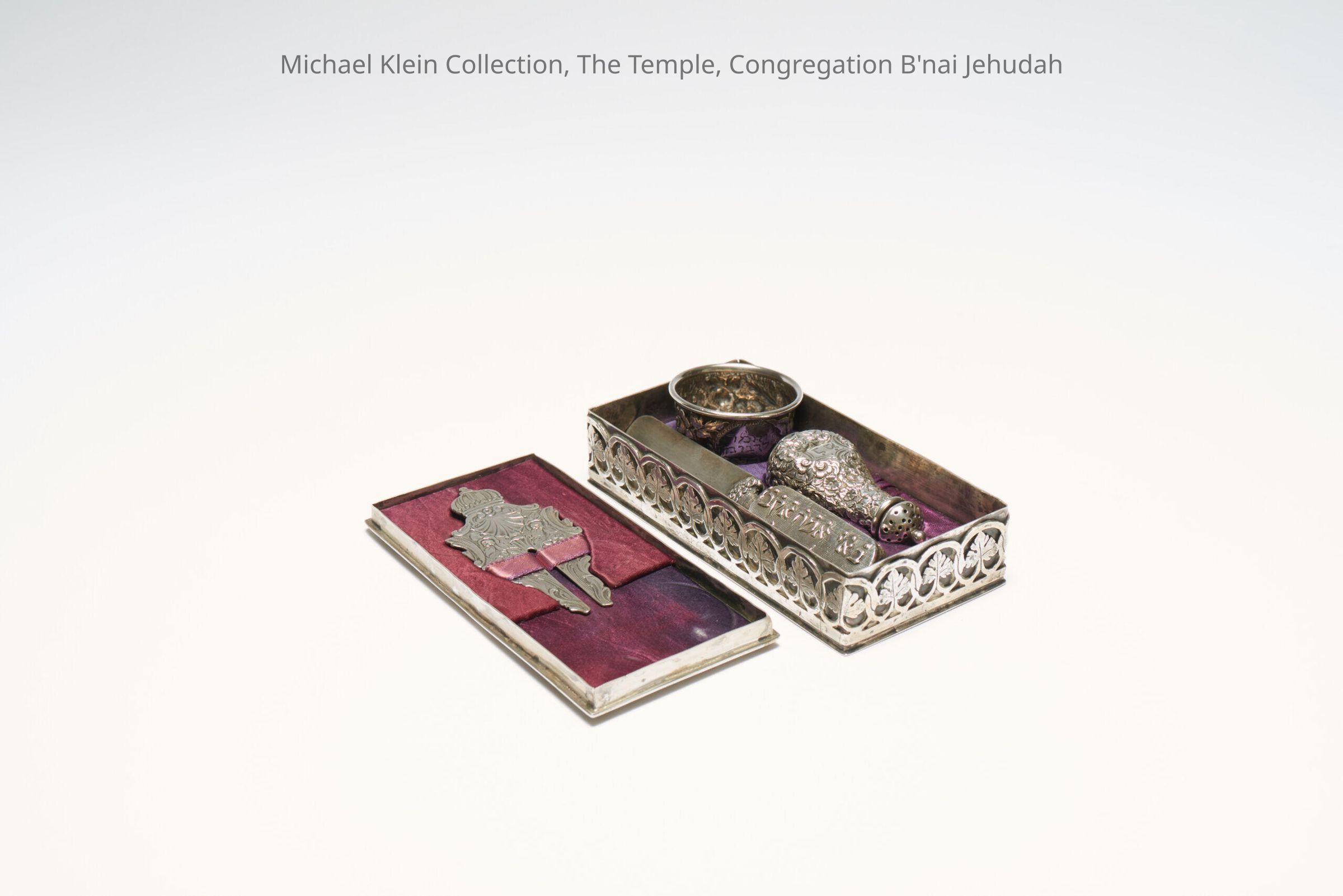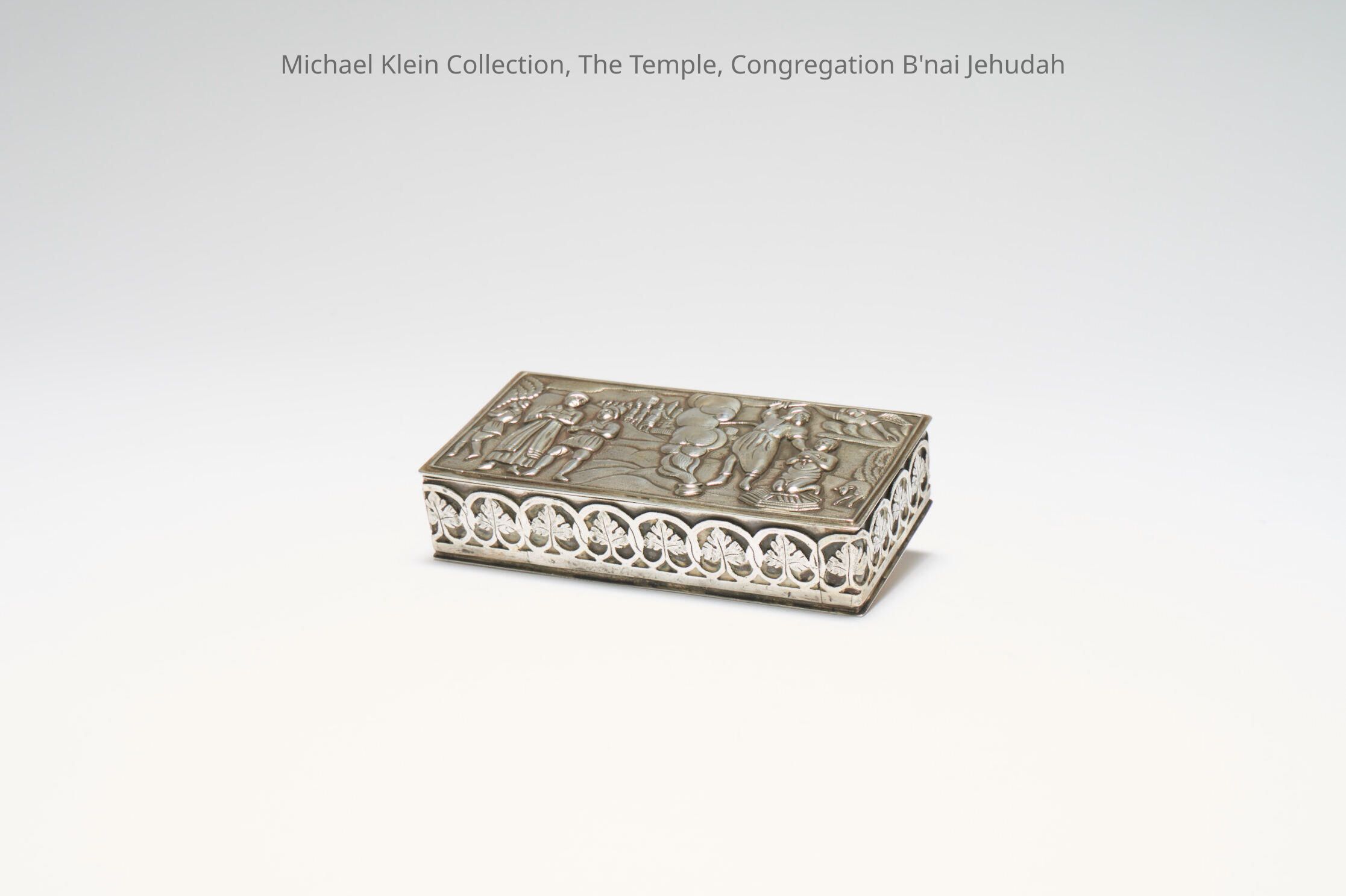 The lid of this silver box has a scene of the Binding of Issac with figures dressed in Medieval German apparel. The box contains a shield, a knife, a flask for powder, and a wine cup for the child.Made/Created
