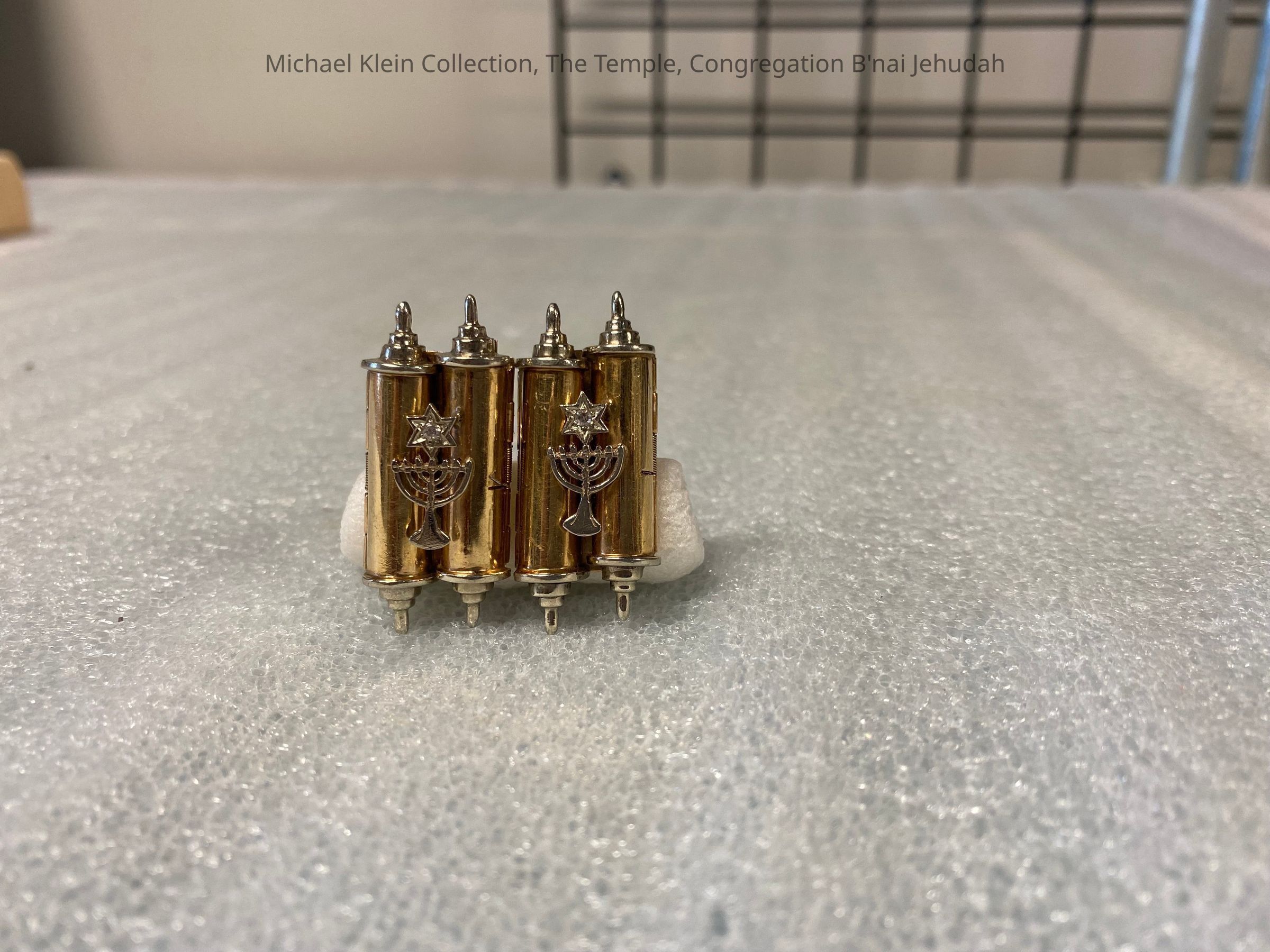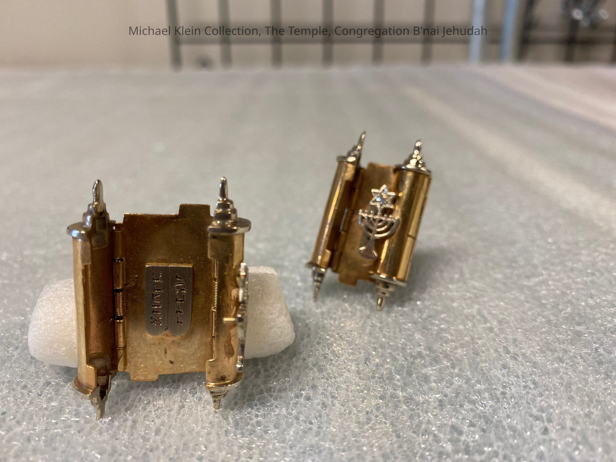 Set of cufflinks that belonged to Rabbi Mayerberg. The torah scrolls open up to display the Ten Commandments.Made/Created