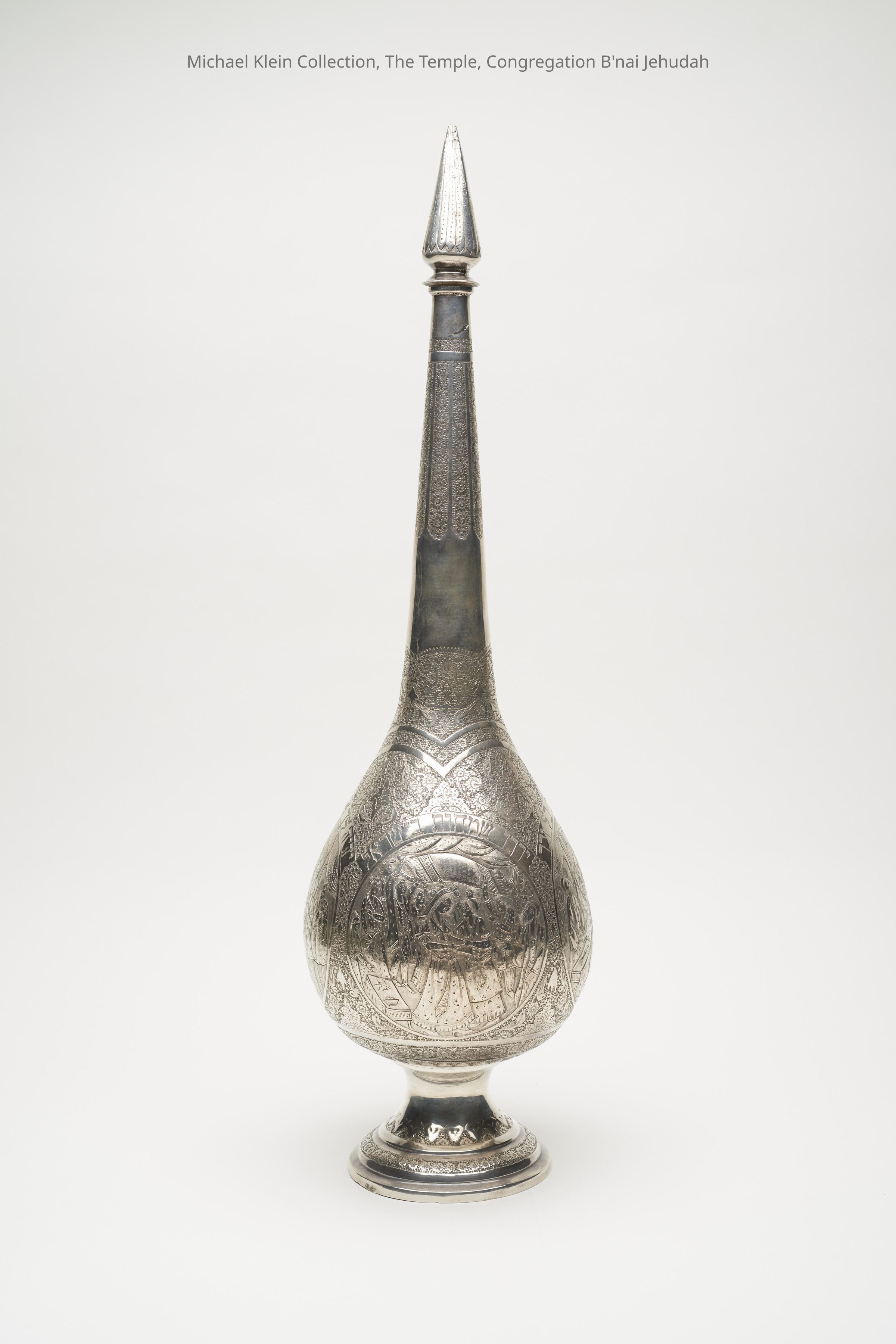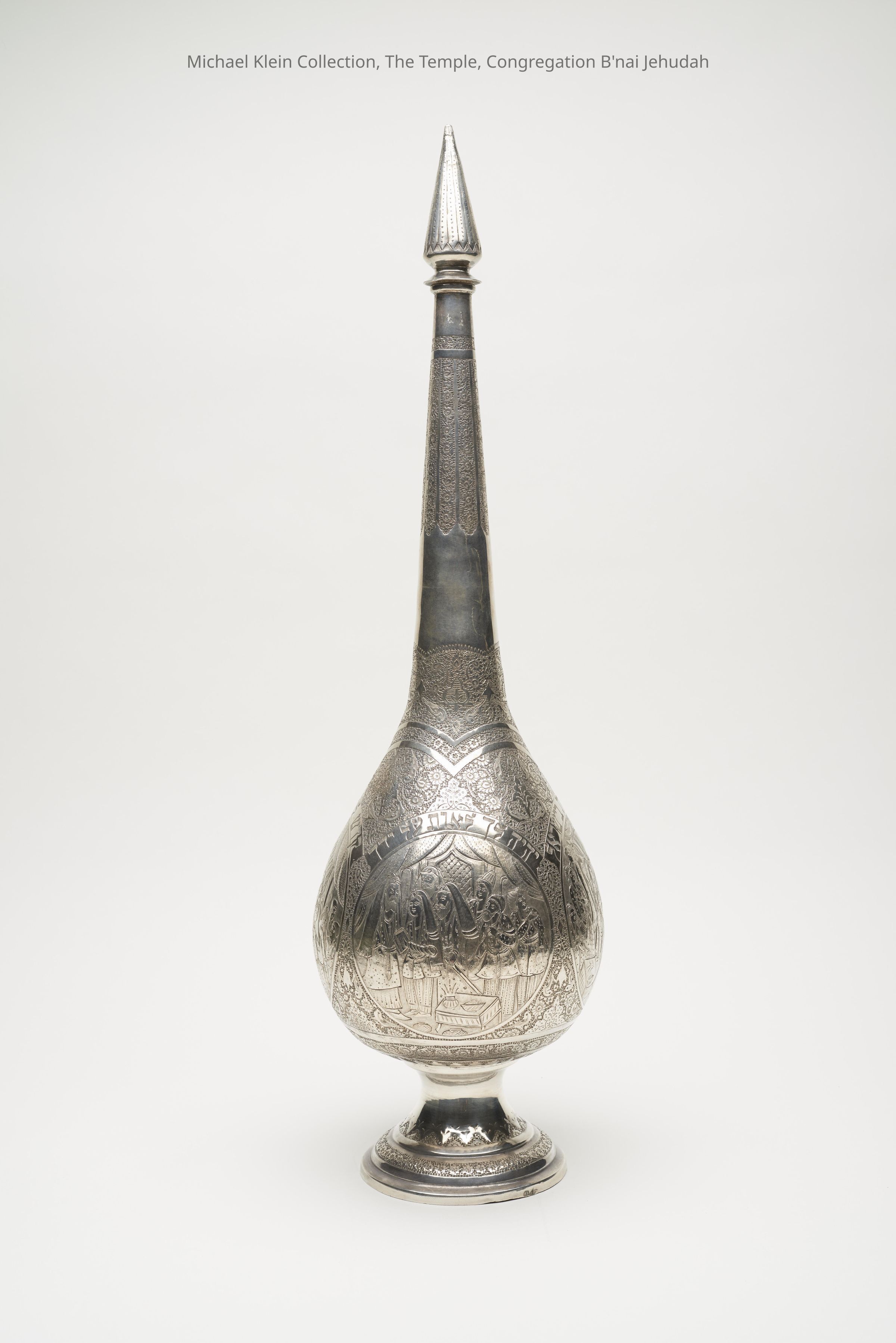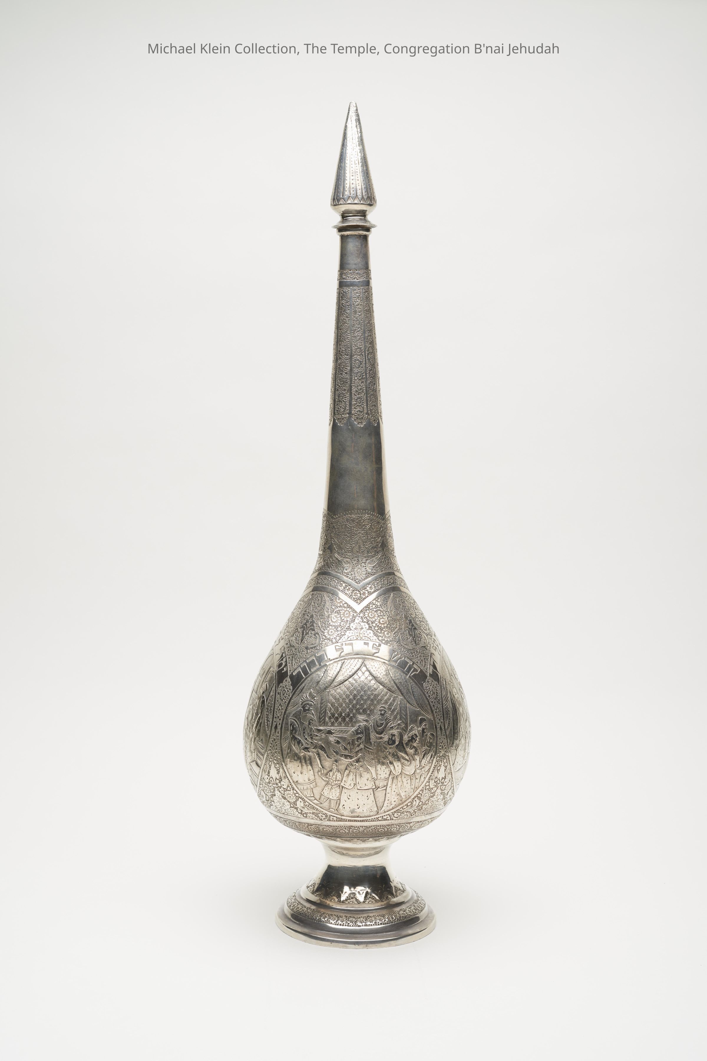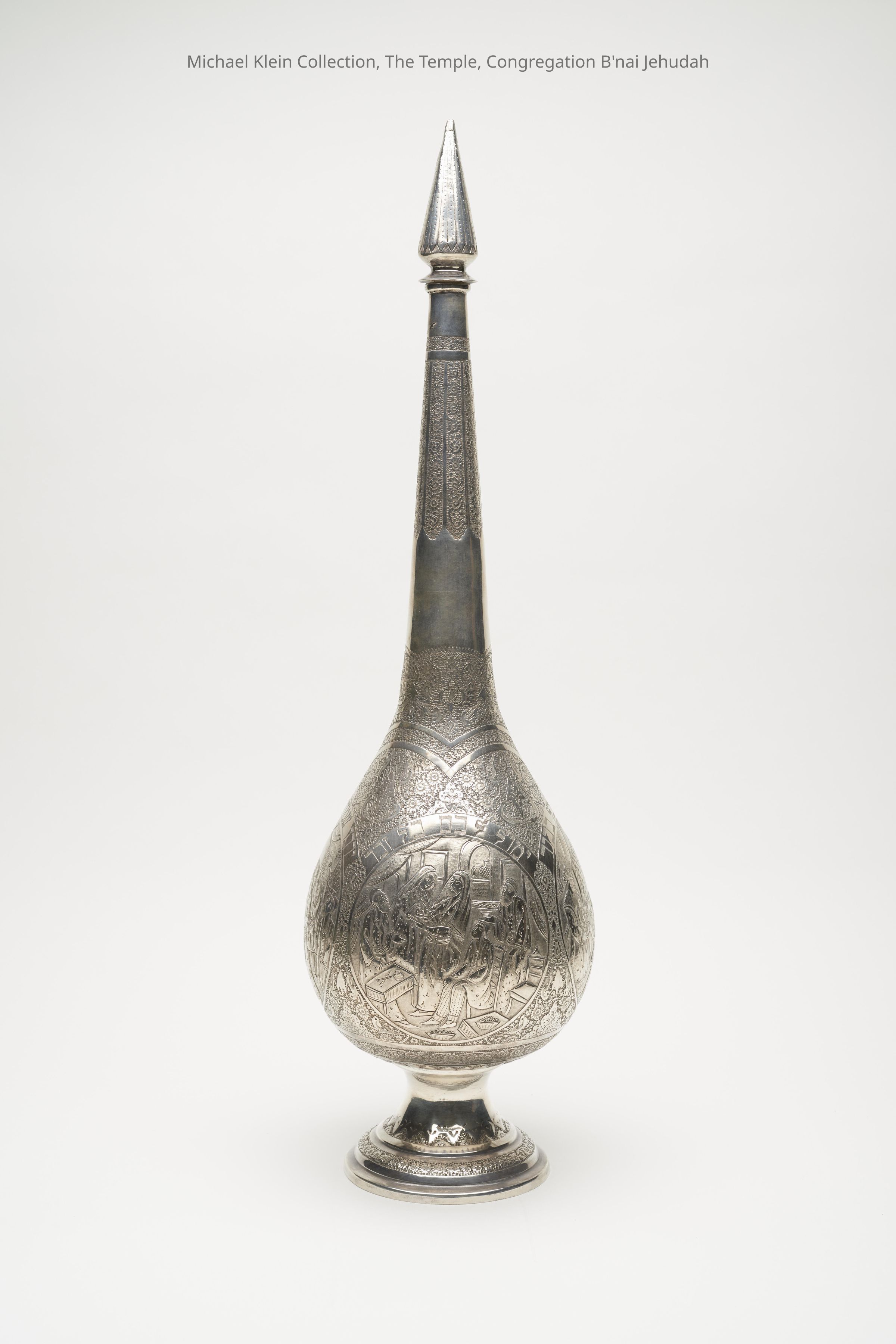 Two pieces, body and stopper. Depicts Jewish celebrations: Wedding, bris, pidyon ha-ben, bar mitzvah with Hebrew above each scene.Made/Created