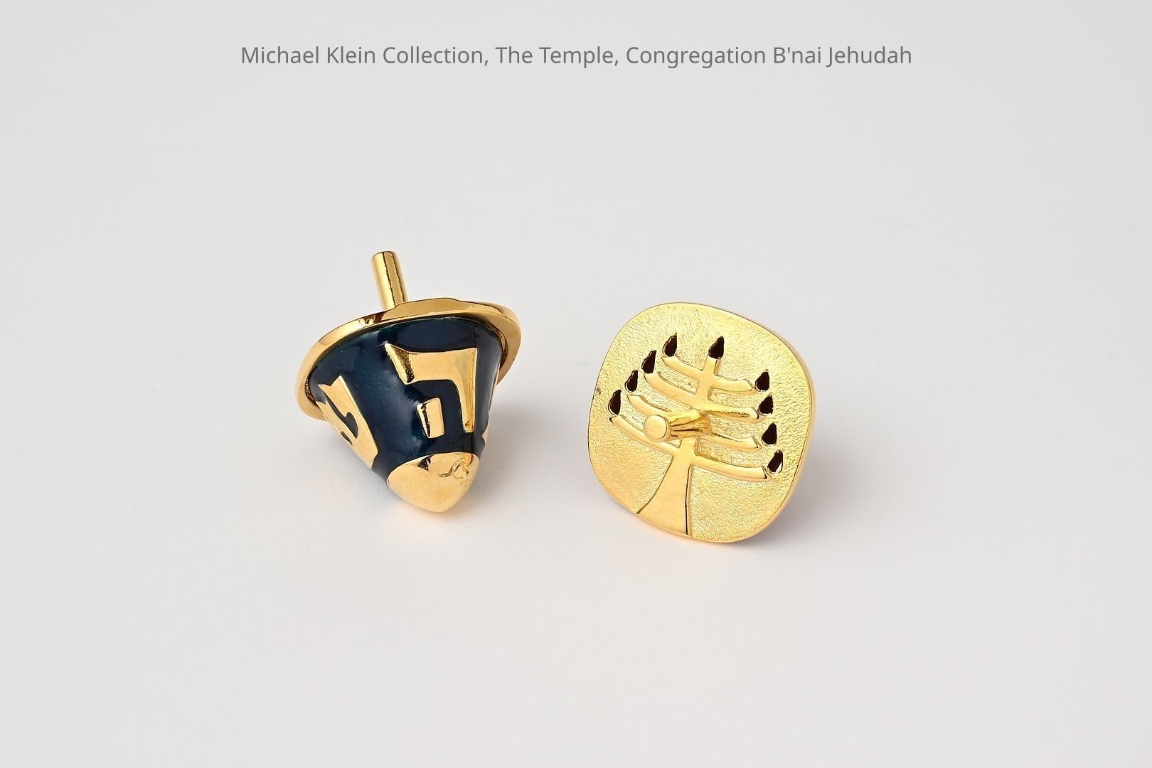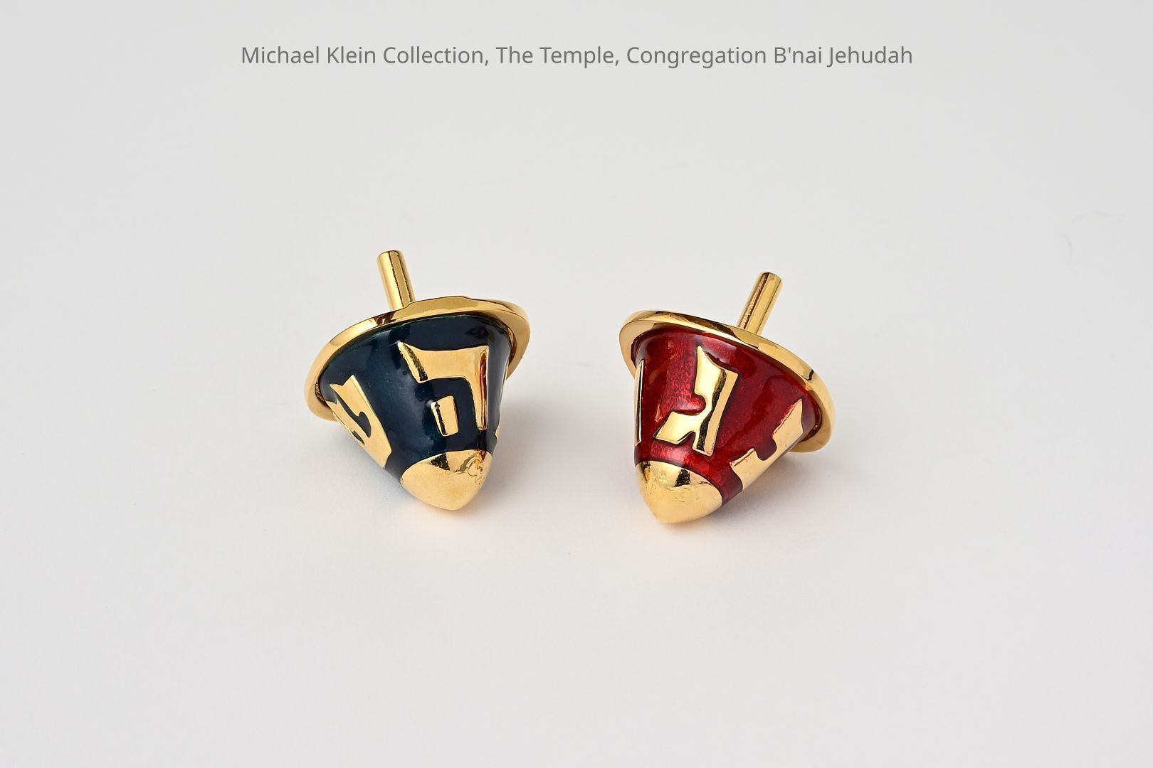 On the upper surface of the Dreidels there is a relief of the Temple Menorah. The body of the Dreidel is made of enamel in shades of blue and redMade/Created