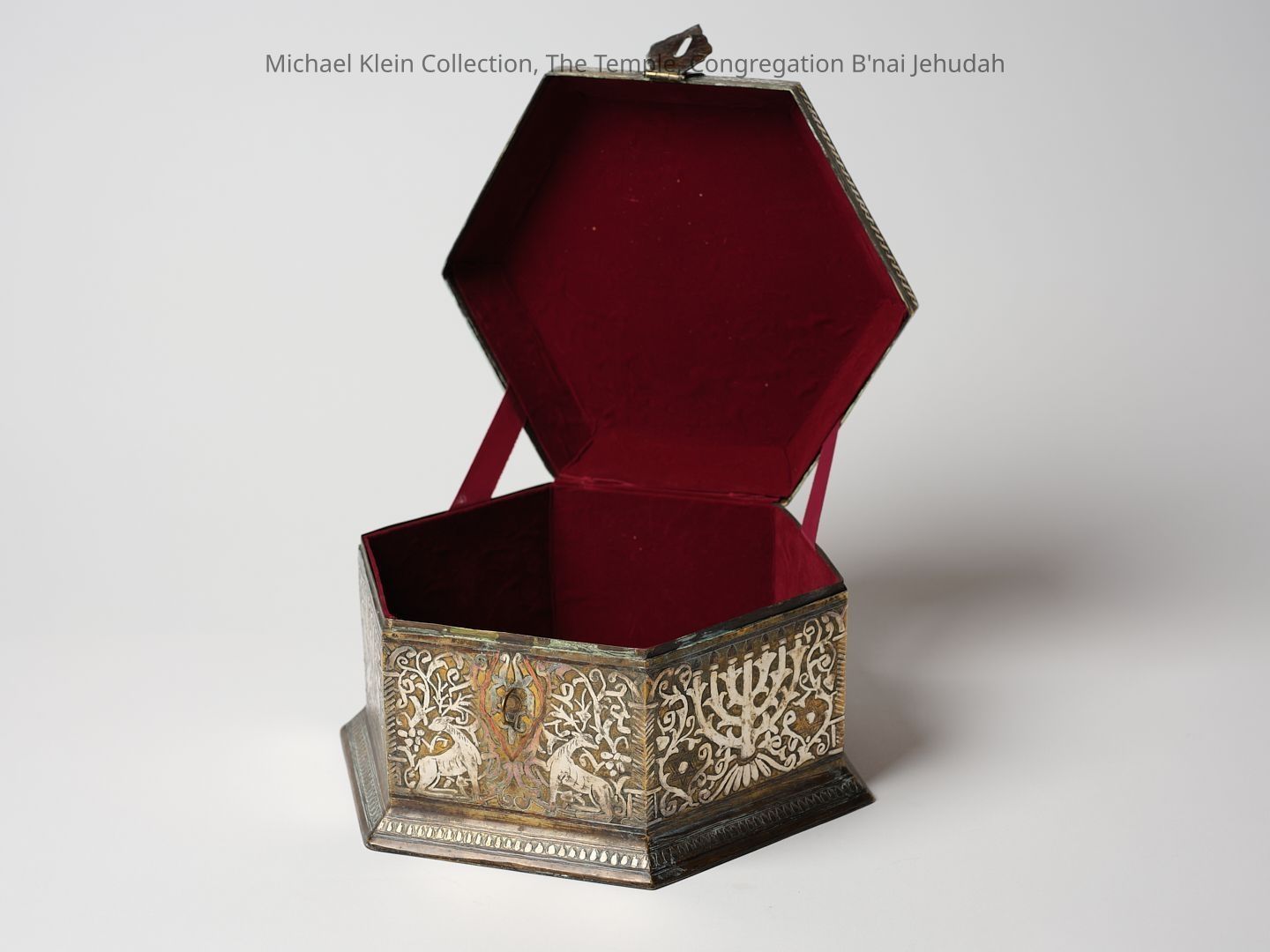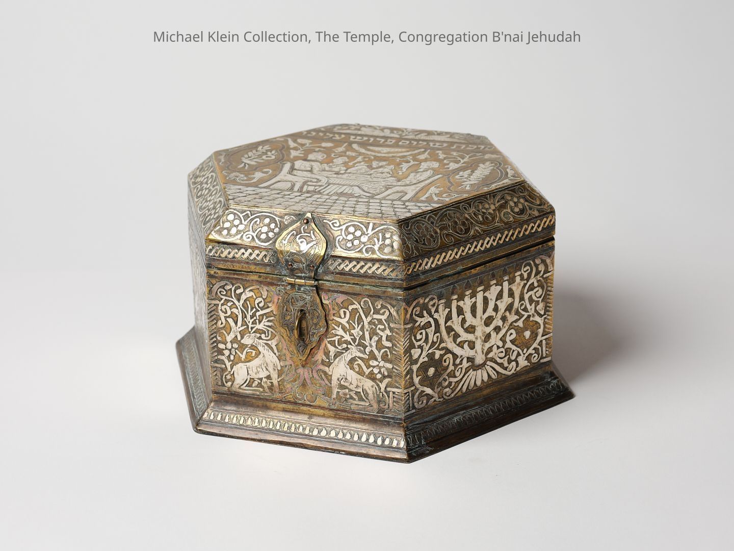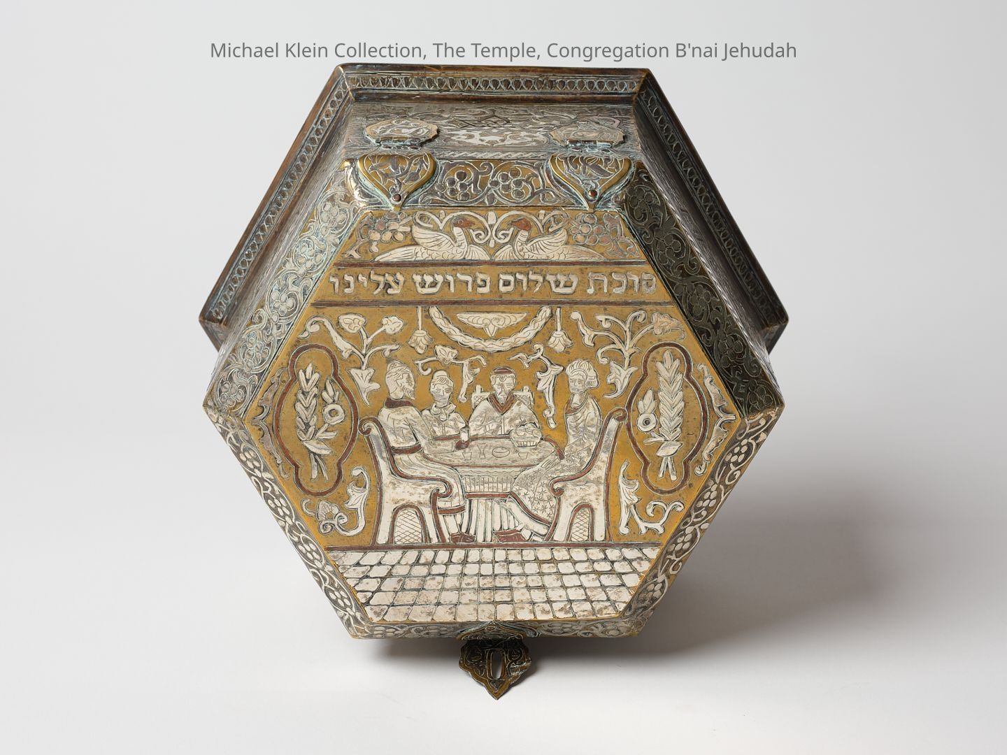 Jewish brass casket for Sukkot, inlaid with silver and copper (Damascene). Lid decorated with Jewish figures sitting under the Sukkah with Hebrew inscription. The side parts decorated with Jewish motifs of Menorah, Stars of David and pair of lions holding the Tablets of Stone with a Torah crown above them. Velvet interior.